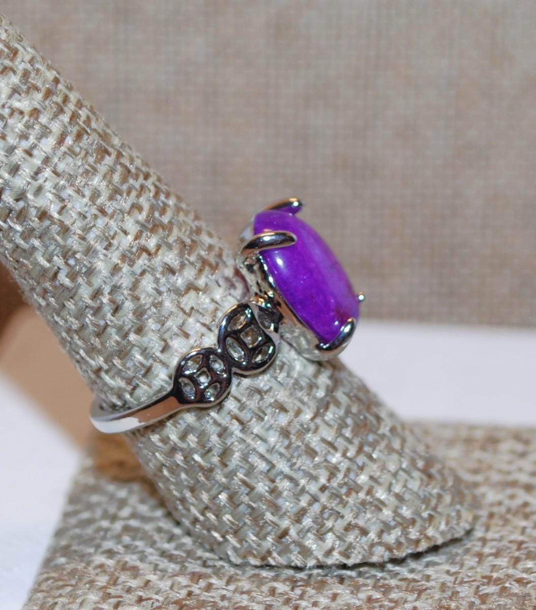 Size 7 Purple Amethyst Oval Stone Ring with 2 Open Spheres as Side Accents on a Silver Tone Band (3.1g)