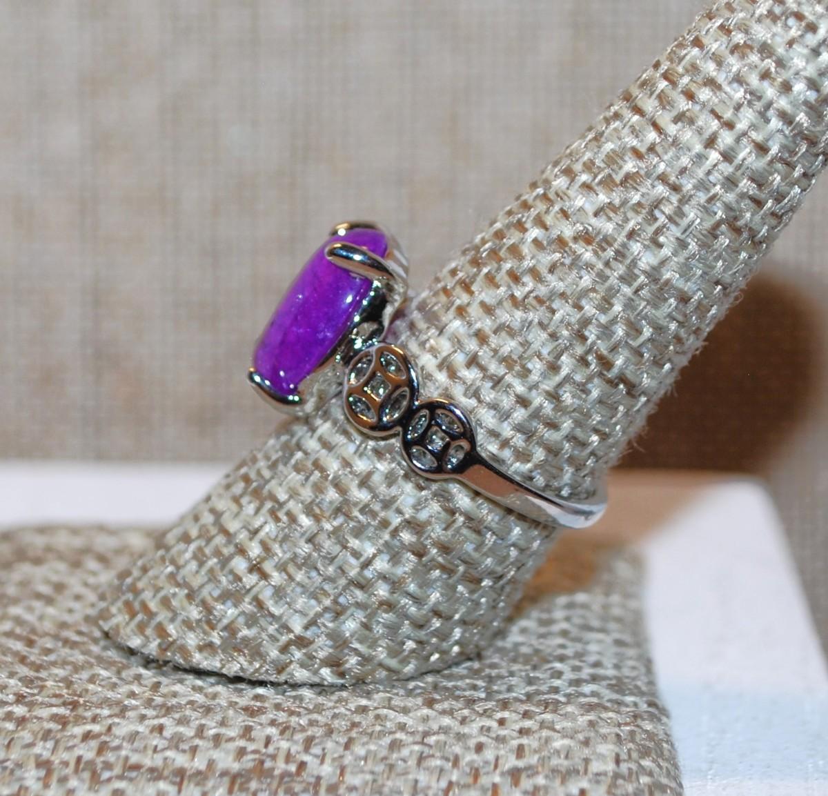 Size 7 Purple Amethyst Oval Stone Ring with 2 Open Spheres as Side Accents on a Silver Tone Band (3.1g)