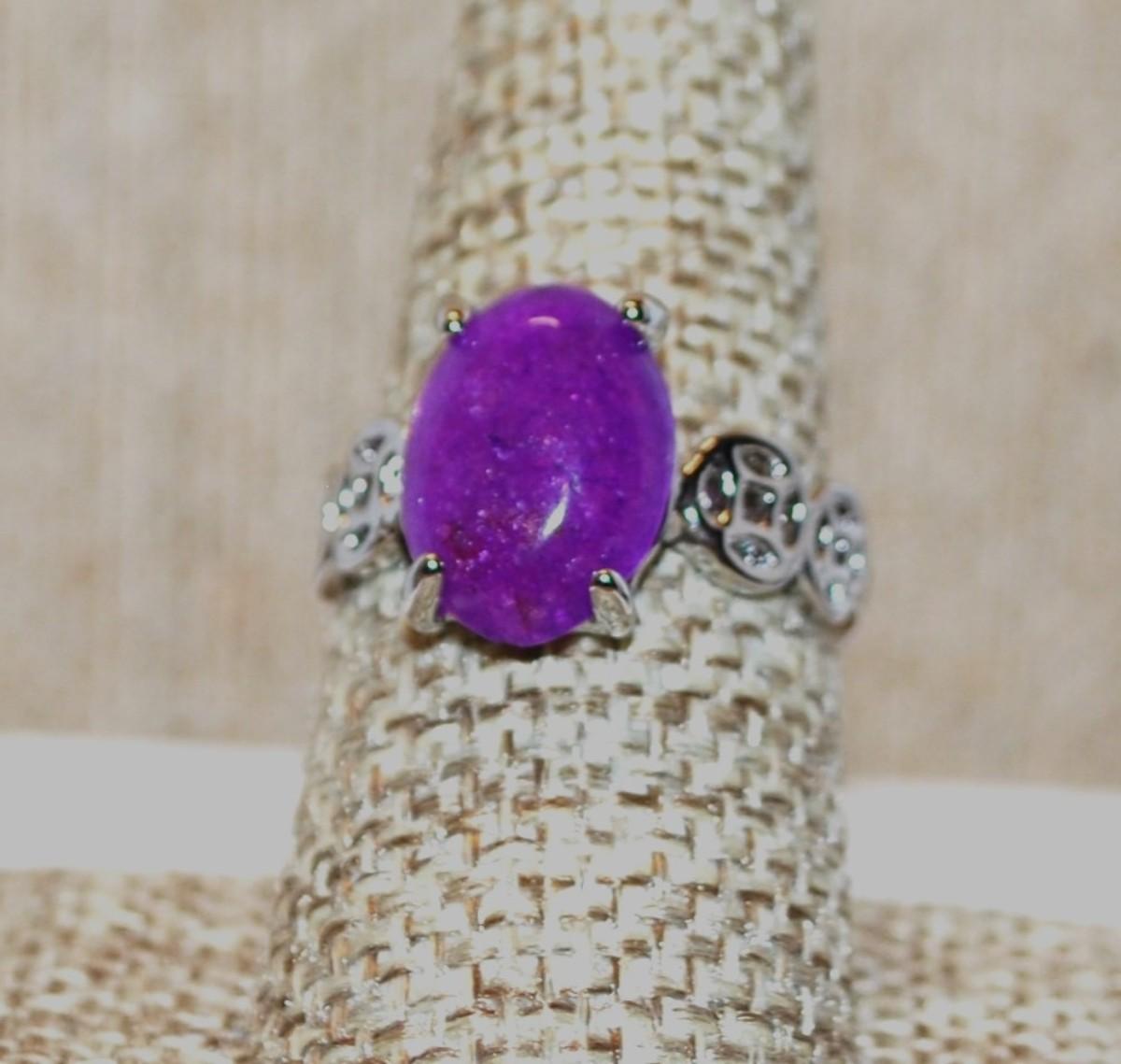 Size 7 Purple Amethyst Oval Stone Ring with 2 Open Spheres as Side Accents on a Silver Tone Band (3.1g)