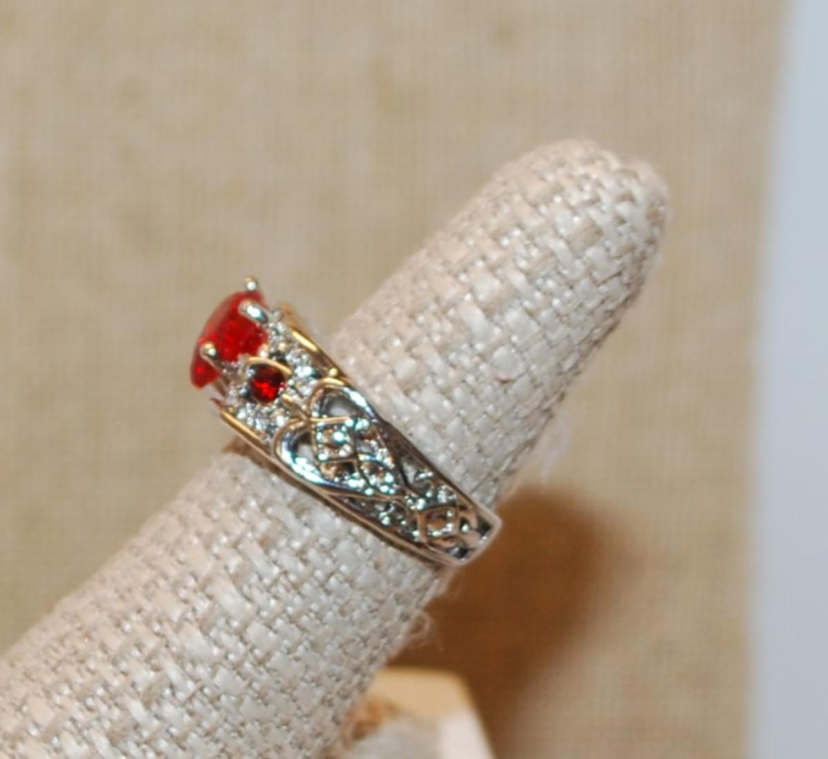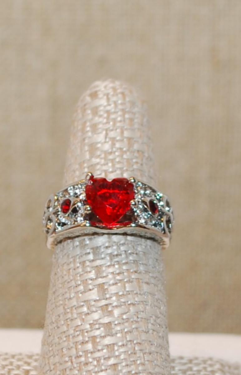 Size 7 RED HEART Main Stone Ring with 2 Round Red Stone Accents on a Solid Silver Tone Band (6.1g)