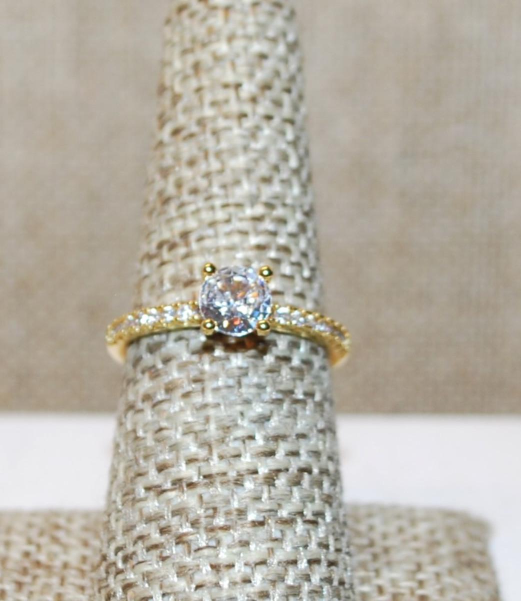 Size 7 Round Clear Main Stone Ring with Side Row Accents on a Gold Tone Band (1.9g)