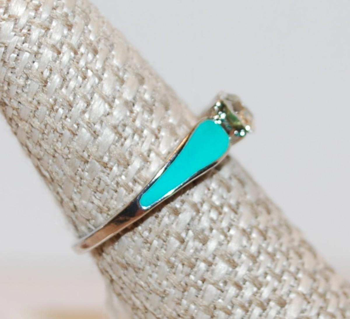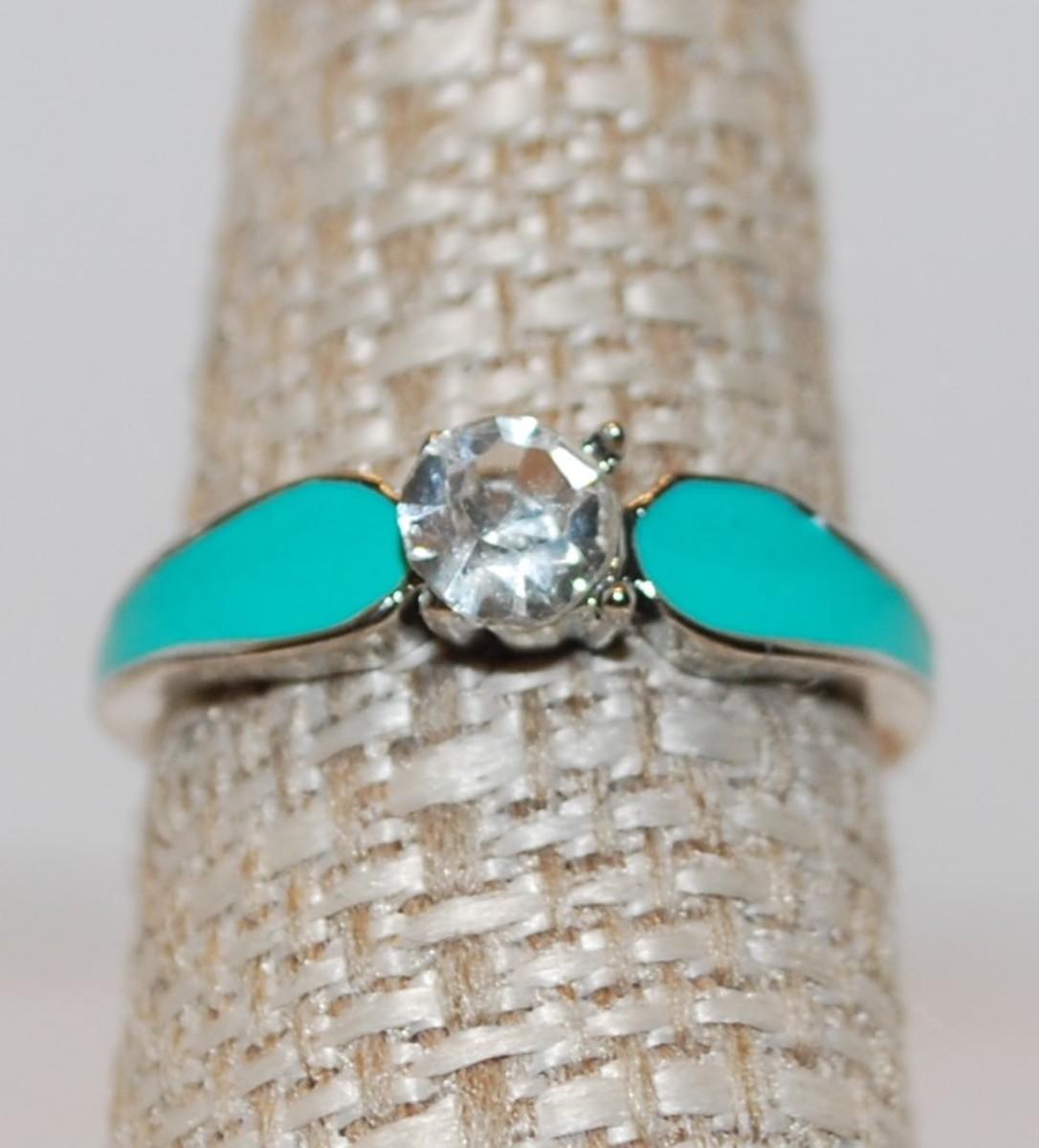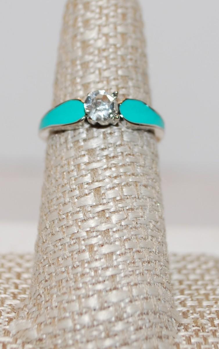 Size 7 Round Cut Clear Stone Ring with 2 Aqua Side Inlays (2.5g)