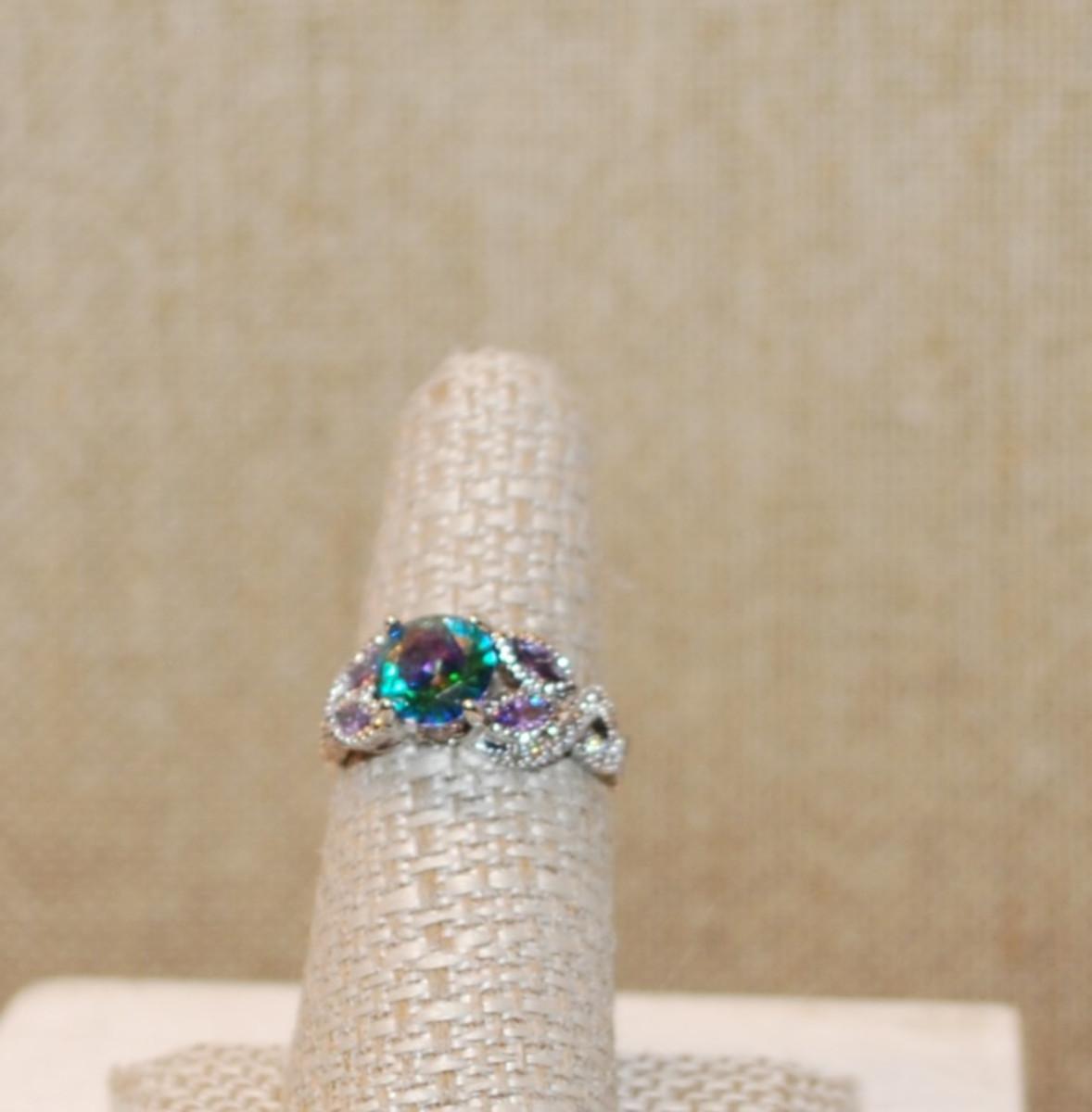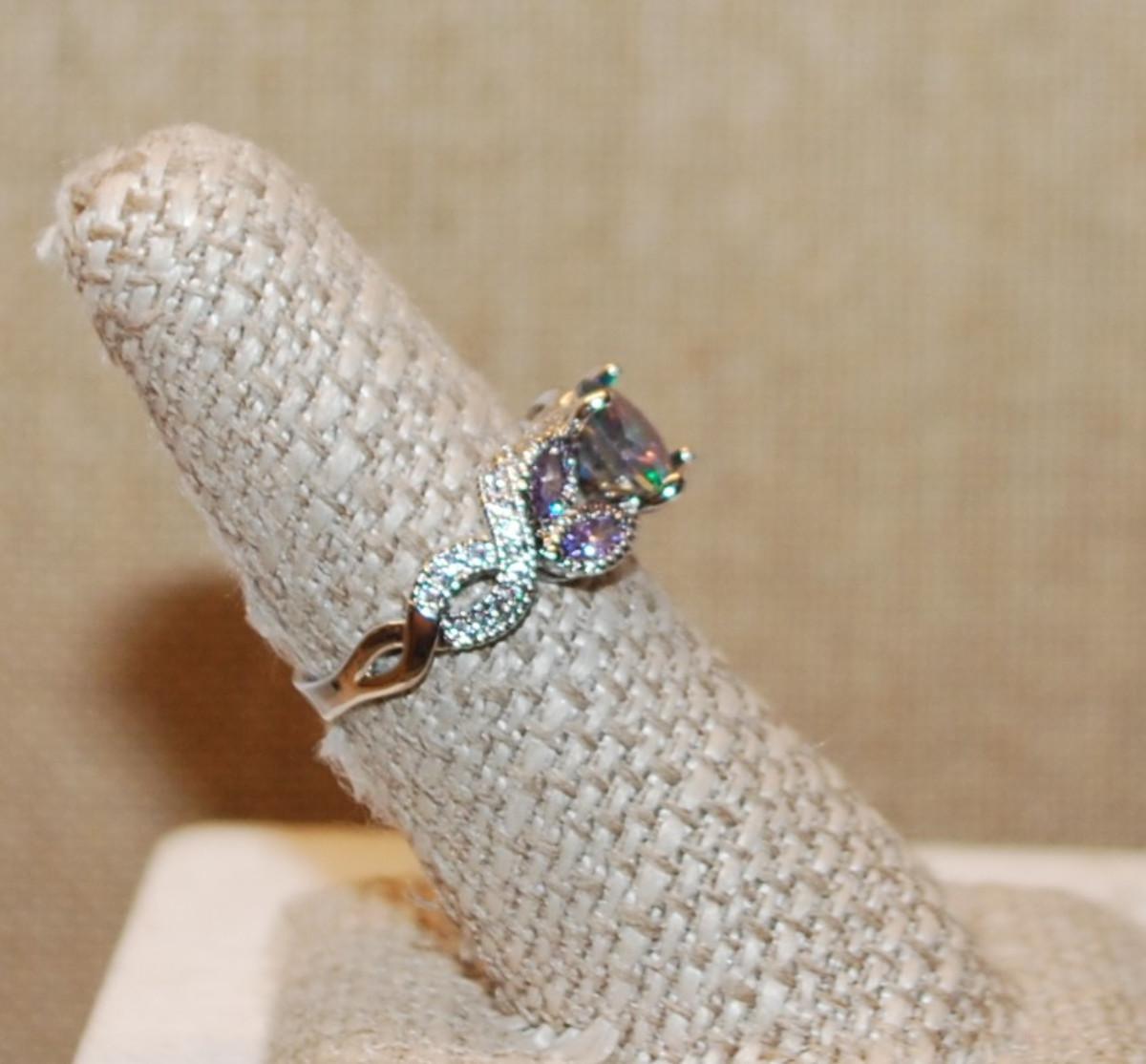 Size 7½ Round Iridescent Main Stone Ring with Purple Marquise Cut Side Stone Accents on a Silver Tone Band (3.0g)