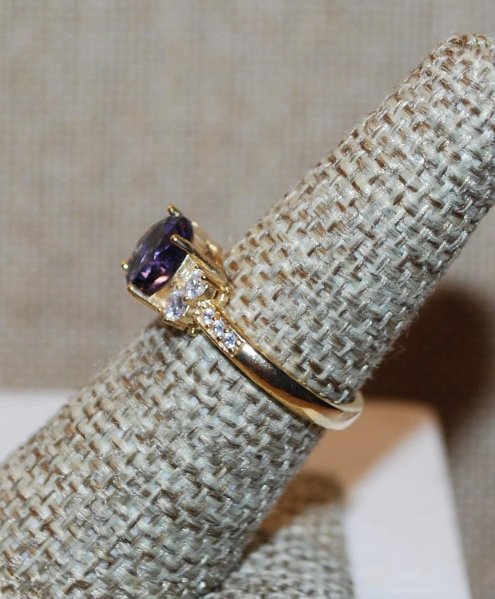 Size 7 Round Purple Stone Ring with Clear Stones Side Accents on a Gold Tone Band (2.4g)