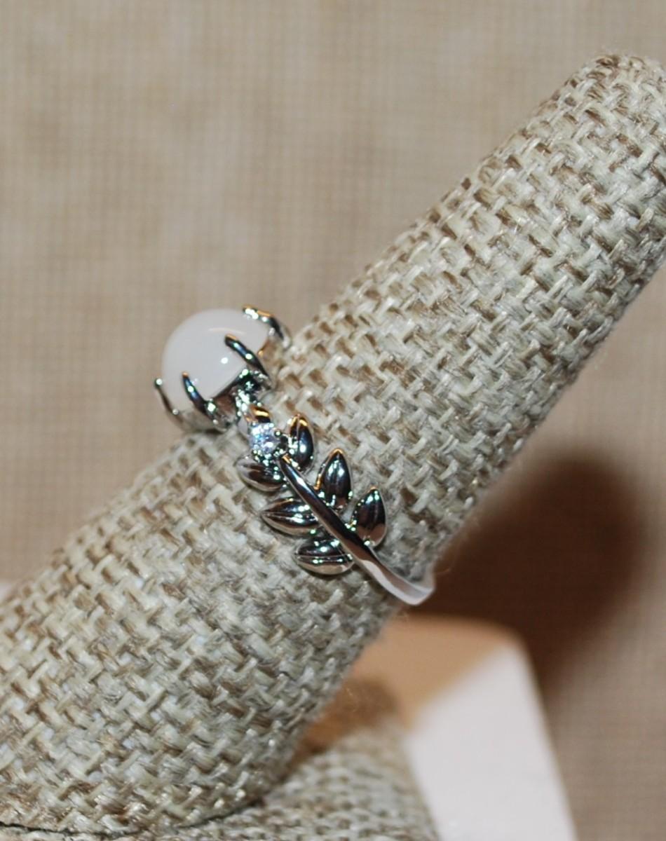 Size 7 Round Solid Opaque Opal-Style Ring with Side "Branch" Accents on a Silver Tone Band (2.2g)