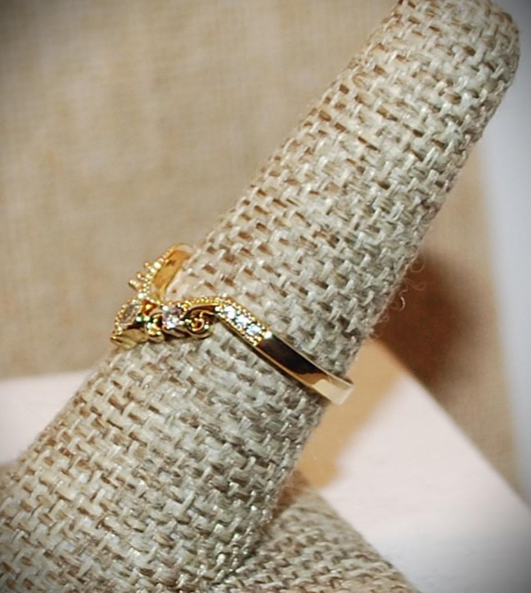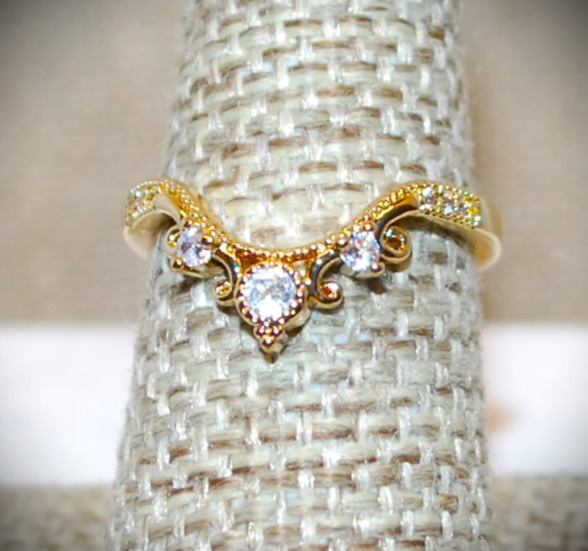 Size 7 Rounded "V" Style Curve Ring with 3 Main Clear Stones on a Gold Tone Band (2.1g)