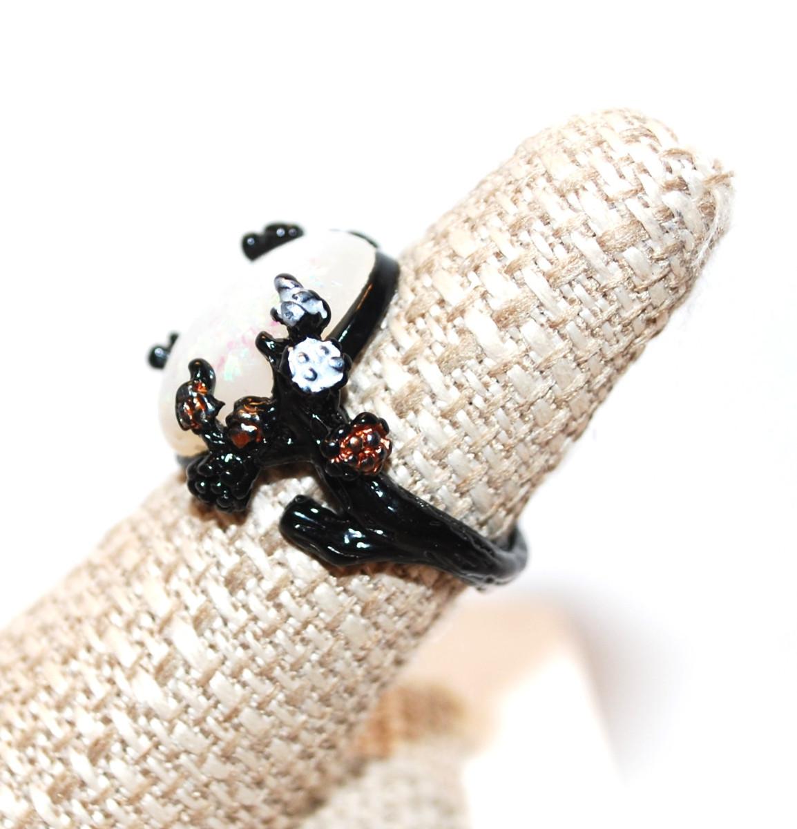 Size 7 ¼ Silver Plated .925 Flowered Black Band with Oval Fire Opal (7.2g)