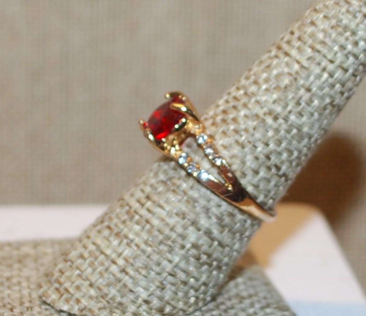 Size 7½ Single Clear Red Round Stone Ring with 2 Rows Side Accent Stones on a Gold Tone Band (2.4g)