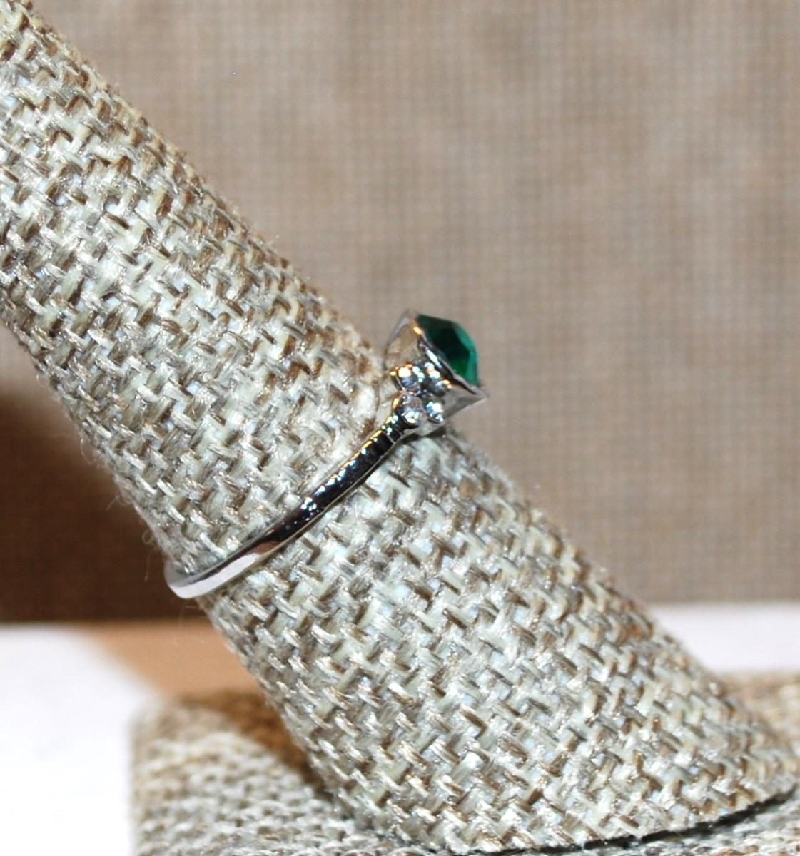 Size 7¼ Single Green Faceted Center Stone Set in a Round "Nest" Ring with 3 Clear Stones Side Accents and Silver Tone Band (1.7g