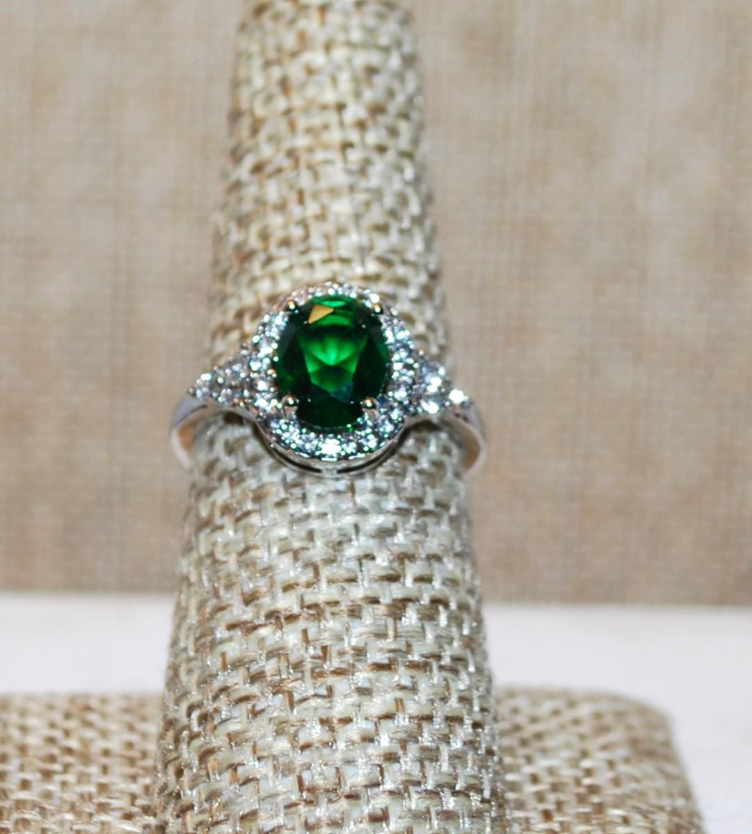 Size 7 Single Green Oval Cut Center Stone Ring with Full Surround on a Silver Tone Band (3.7g)