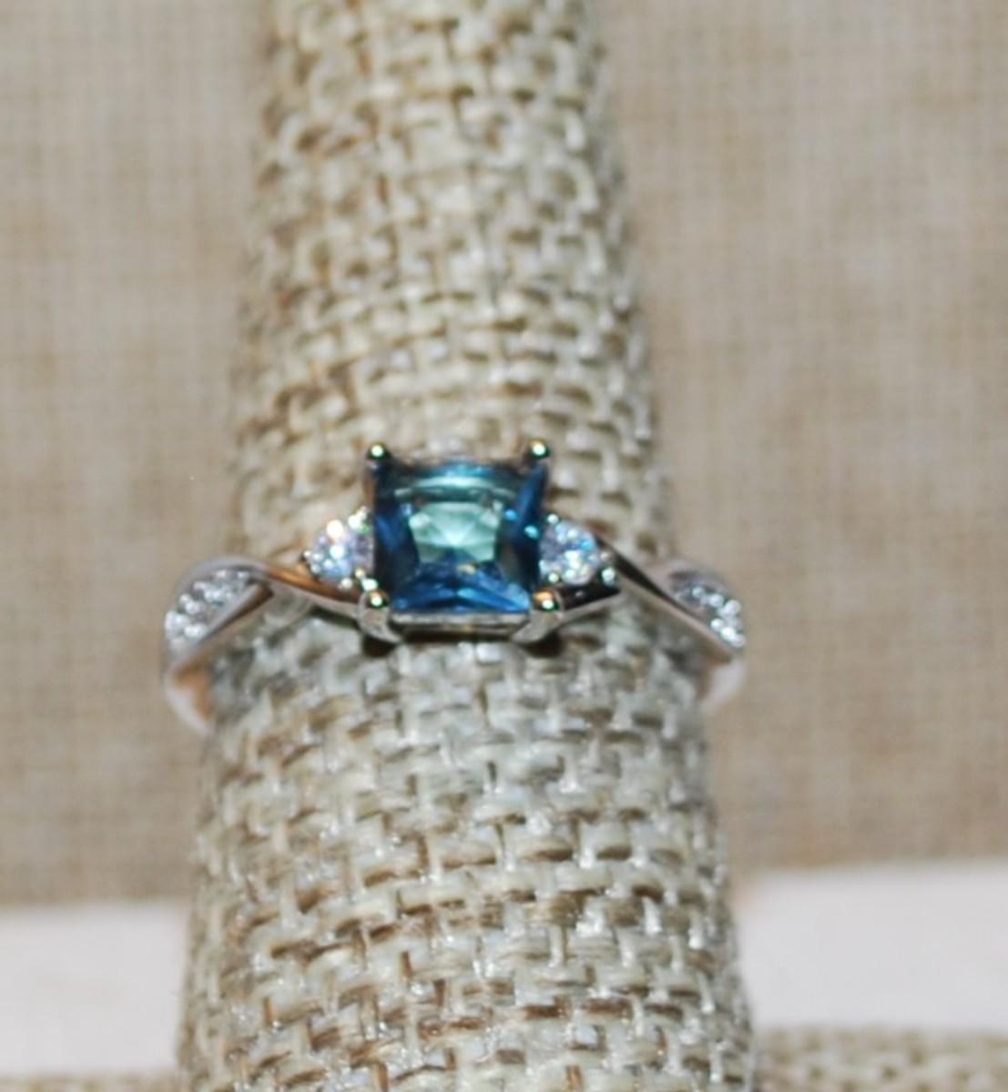Size 7½ Square Cut Blue Transparent Stone Ring with Side Accents Stones on a Silver Tone Band (2.5g)
