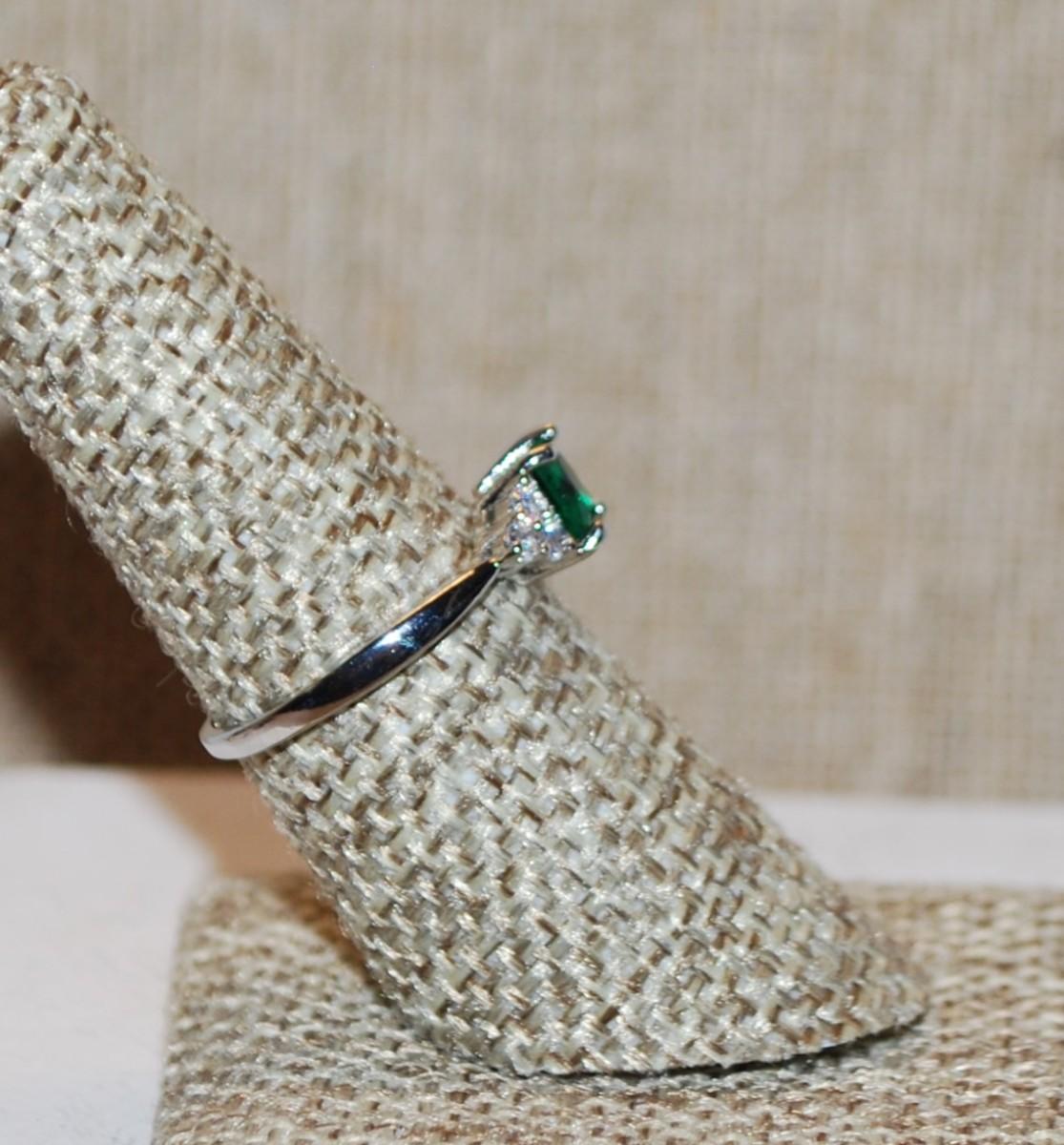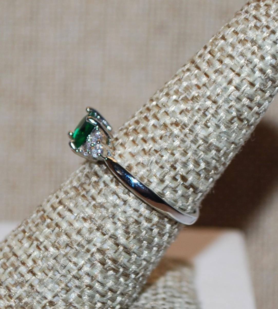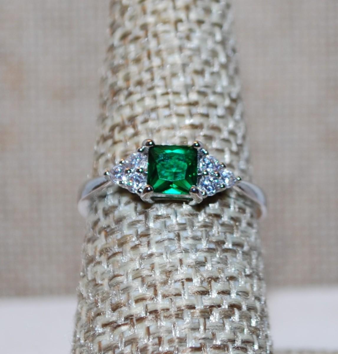 Size 7 Square Green Center Stone Ring with Accent Triangles on a Silver Tone Band (1.6g)