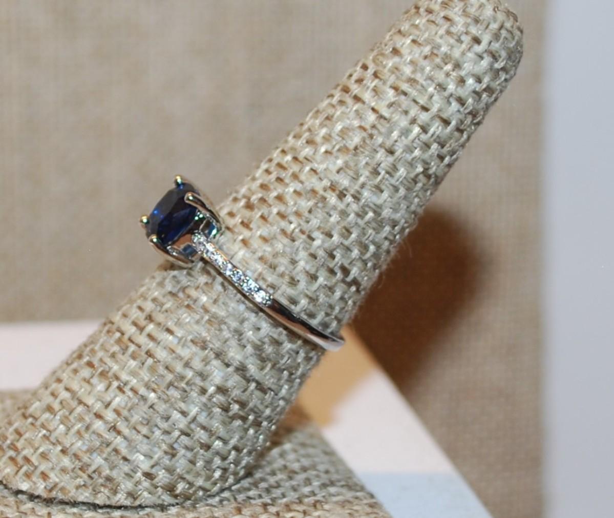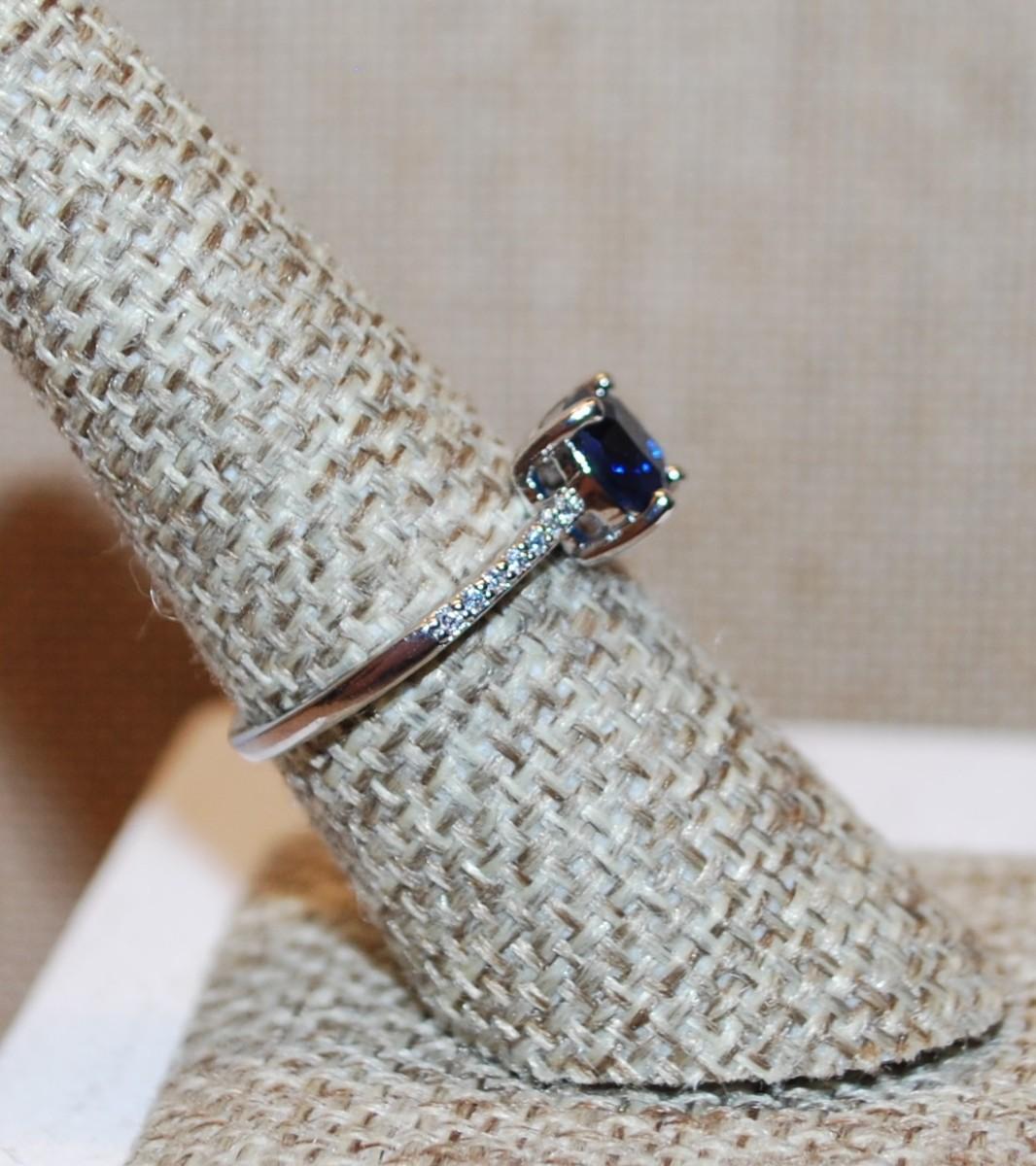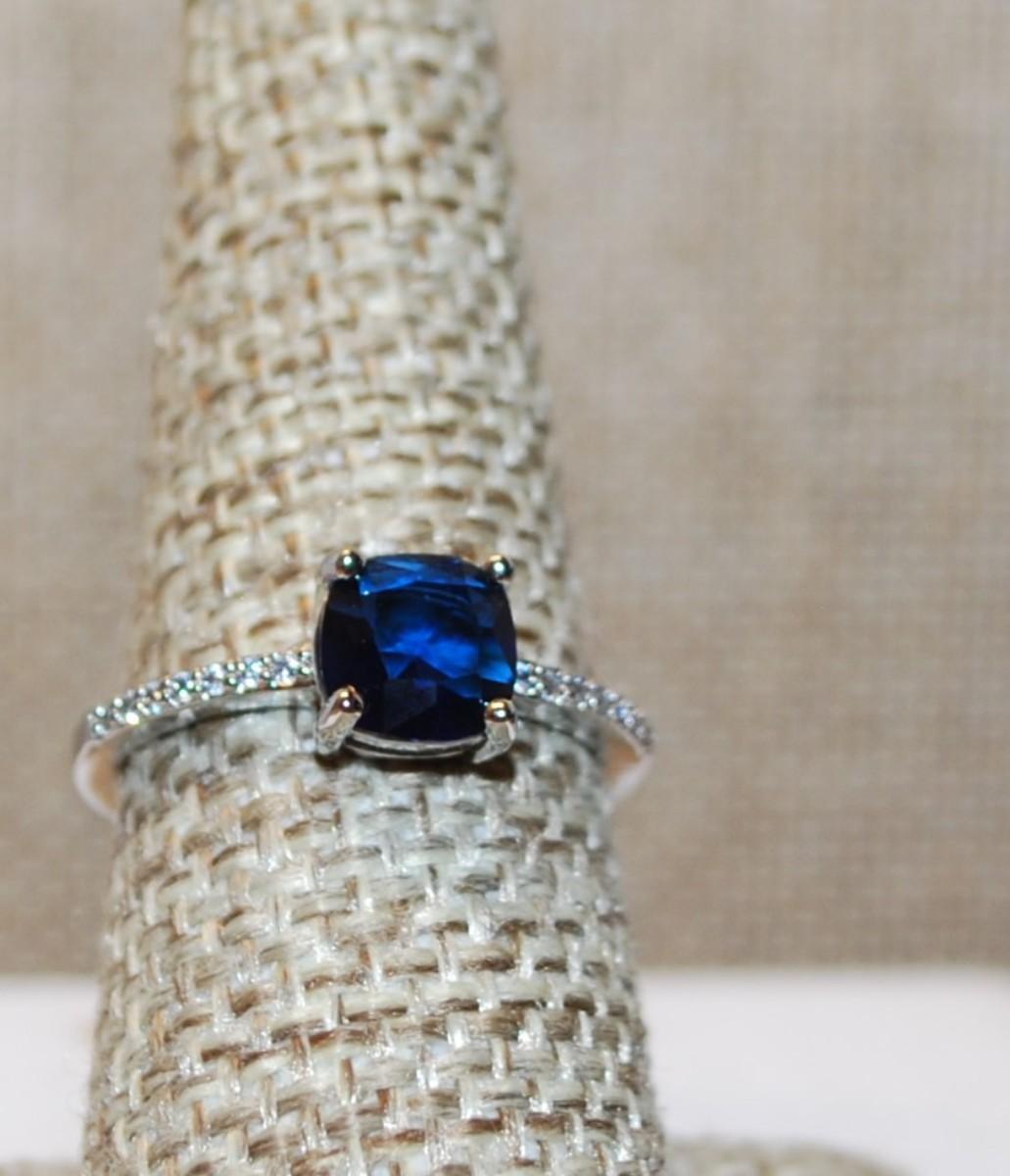 Size 7½ Transparent Dark Blue Stone Asscher Cut 4 Prong with Side Accents on a Silver Tone Band (1.7g)
