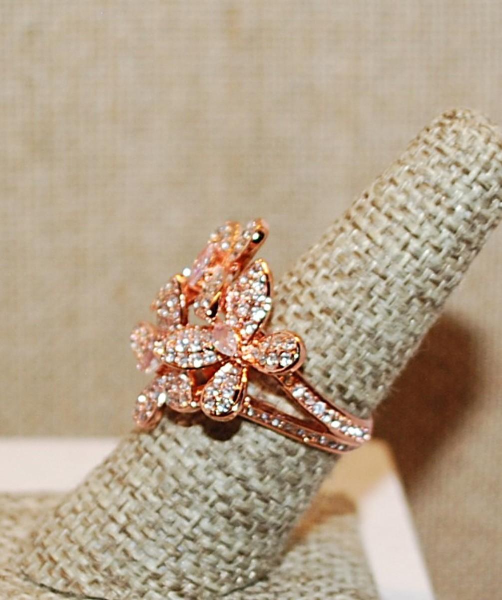 Size 7 ½ Triple Flower Petals Brilliant Stones Party Ring on a Glittery ROSE GOLD Tone Band (7.0g)