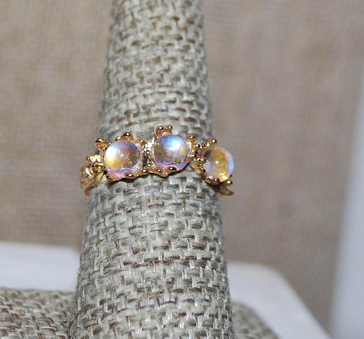 Size 7½ Triple Iridescent Stones RING with Multi-Pronged Gold Tone Setting & OPEN_ENDED Band (2.1g)