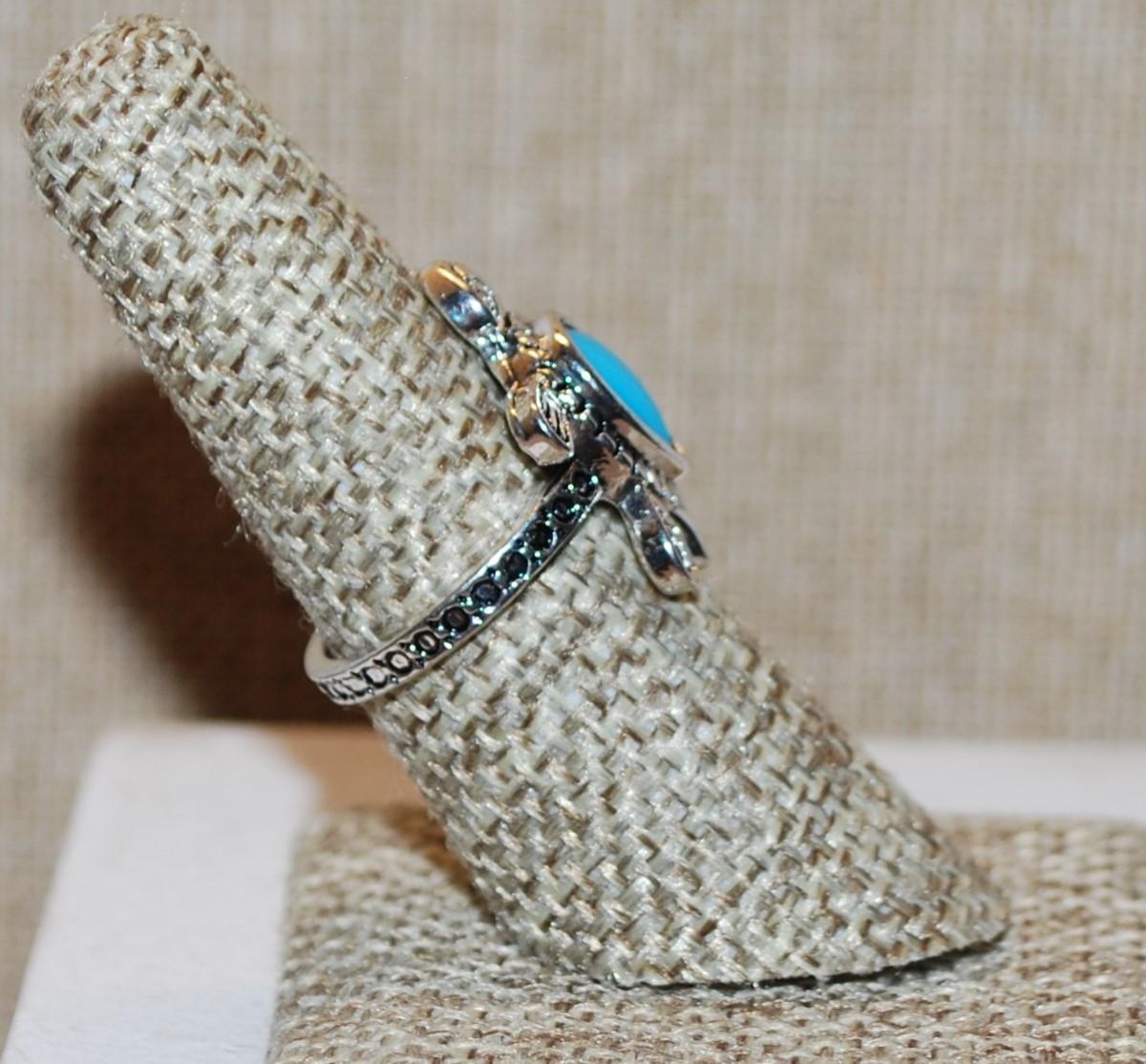 Size 7¼ TURTLE Pear Shaped Turquoise Style Stone Ring with Silver Tone Band (4.5g)