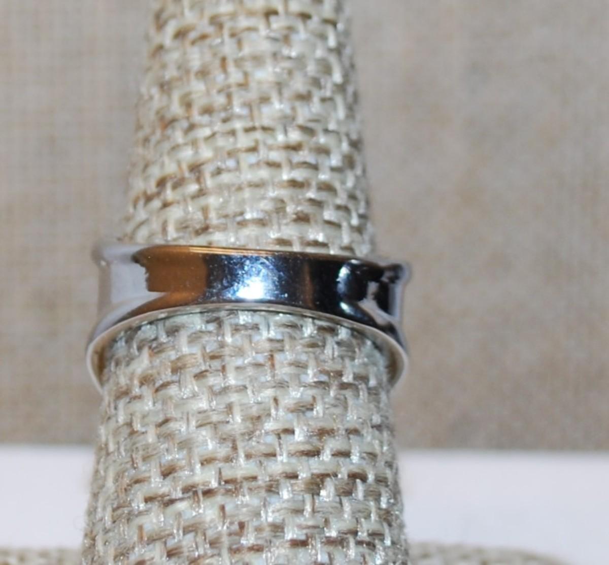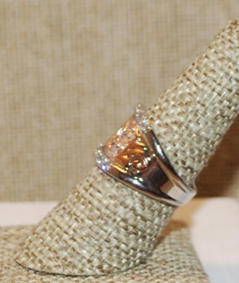 Size 7¾ Two-Tone Graphic Designed Ring with Top & Bottom Accent Stones on a Heavy Silver Tone Band (5.6g)