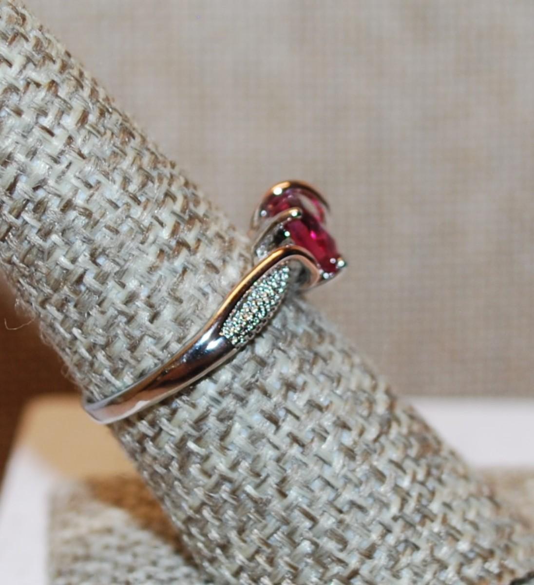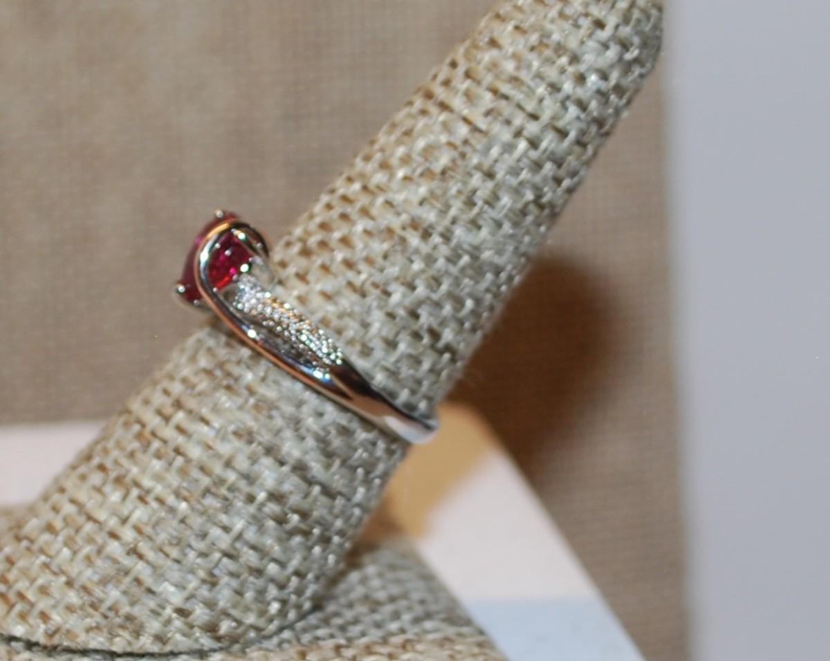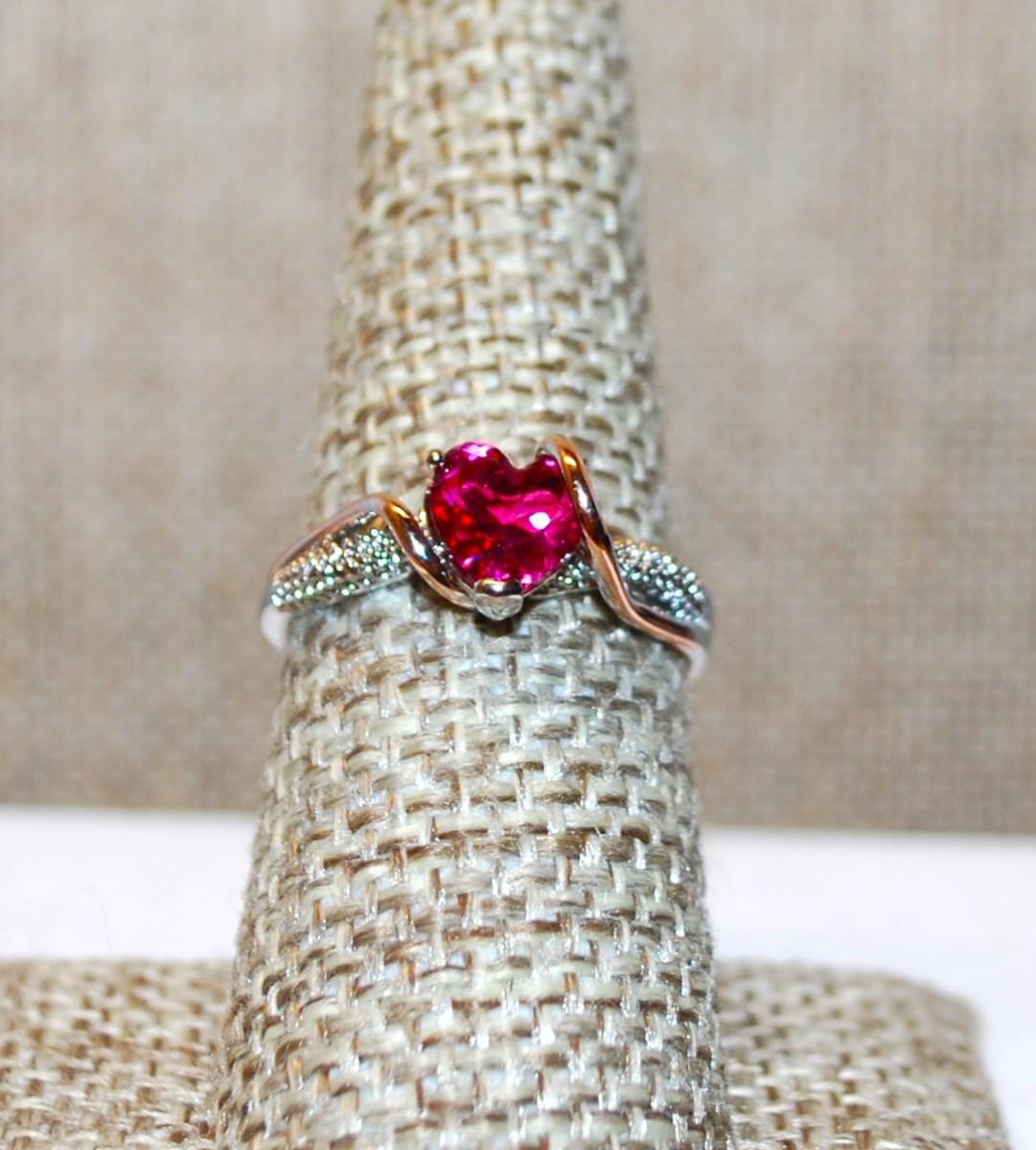 Size 7½ Two-Tone Red HEART Ring with Swirl Accents & Stones on a Silver Tone Band (2.3g)