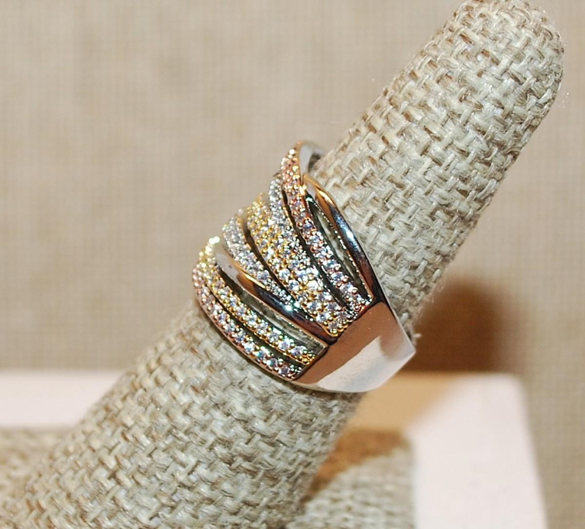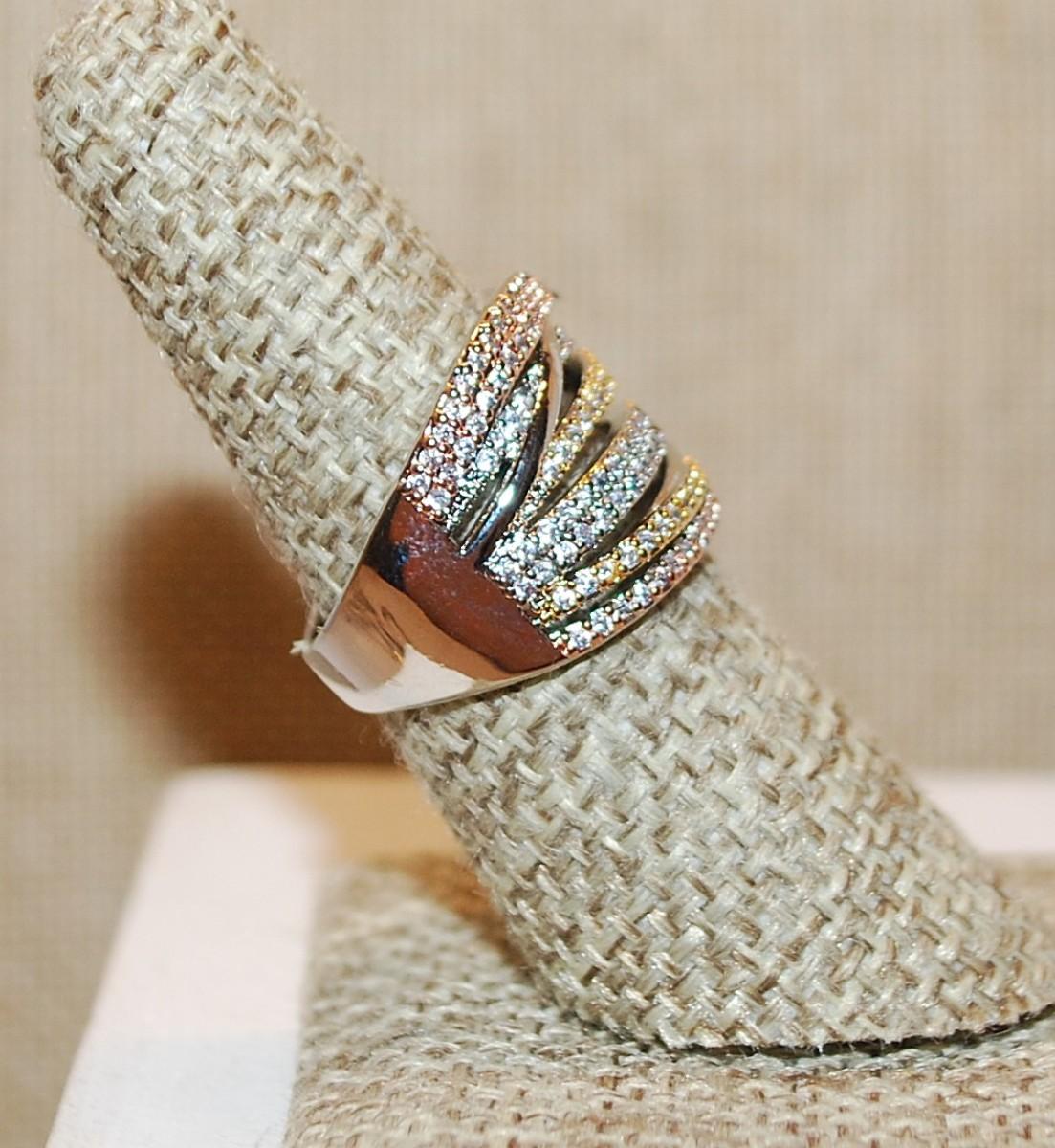 Size 7 Unique Trifecta Colored Ring with Silver, Gold & Rose Gold on a Silver Tone Band (6.7g)