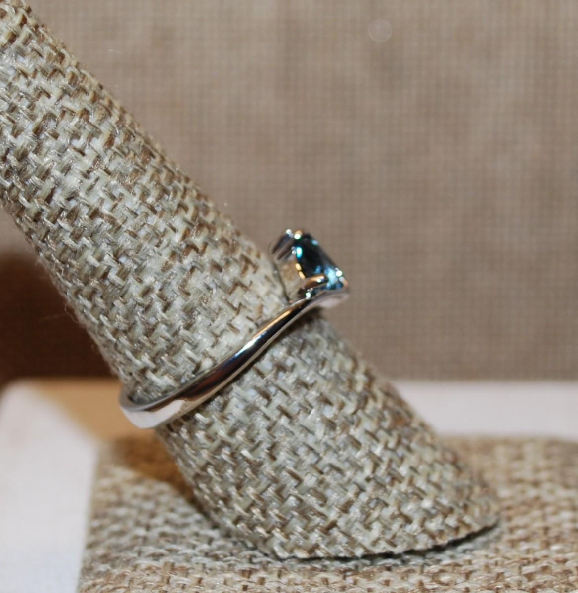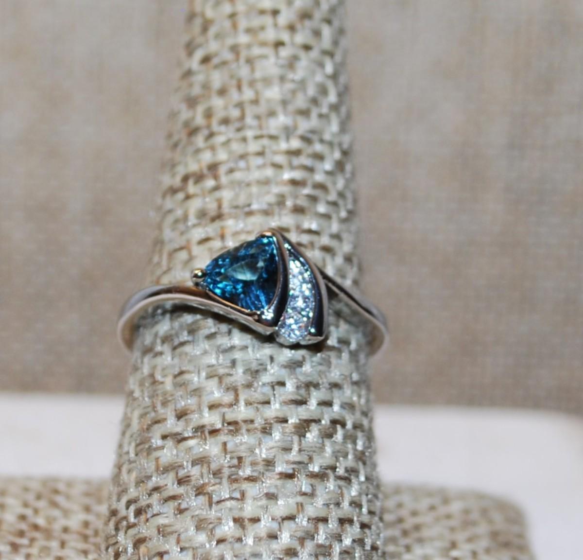 Size 7 ½ Unique Trillion Cut Blue Stone Ring with a Side Accent on a Silver Tone Band (2.7g)
