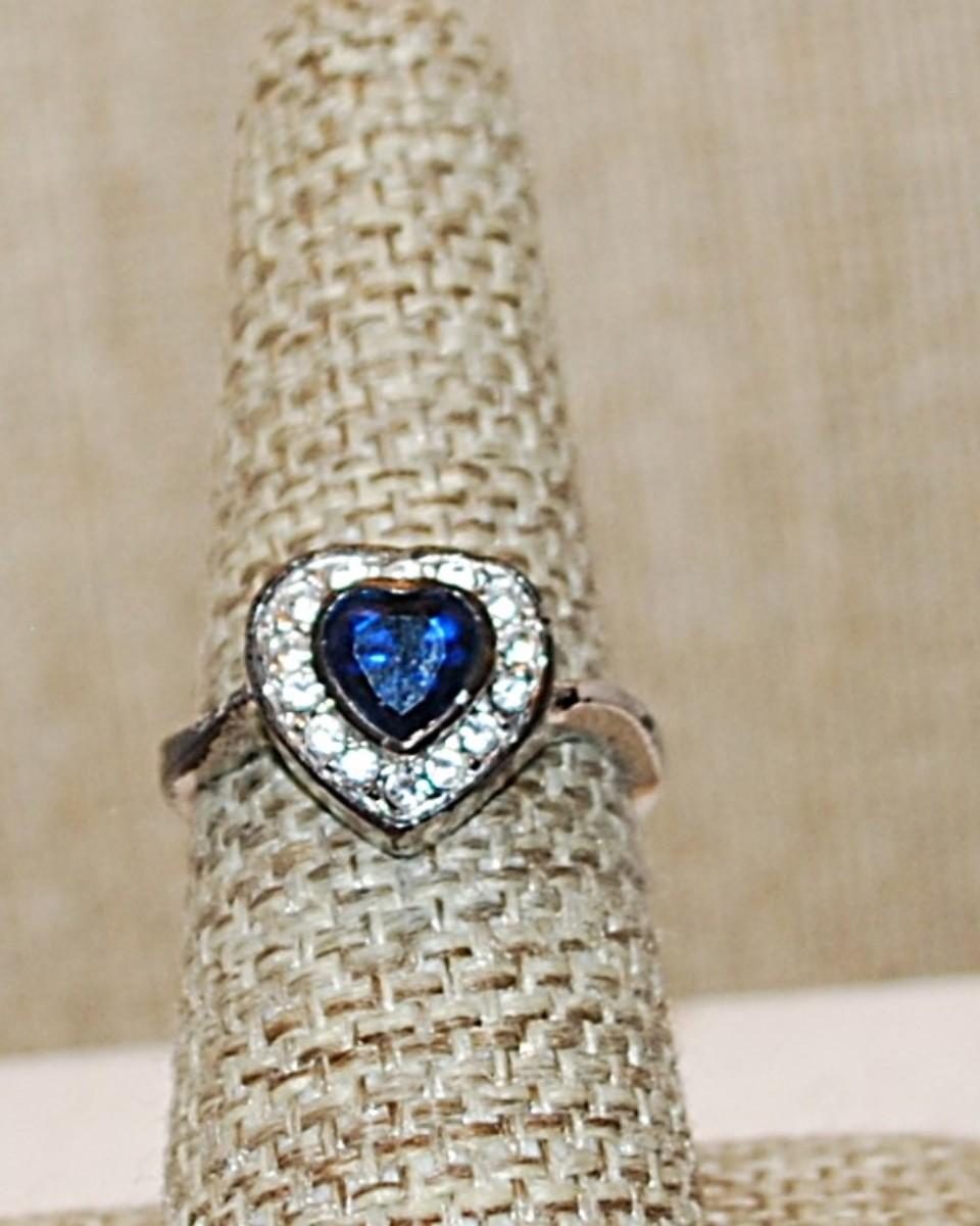 Size 7¼ VINTAGE Deep BLUE HEART Ring on a Heart Setting and Silver Tone Band (3.5g)