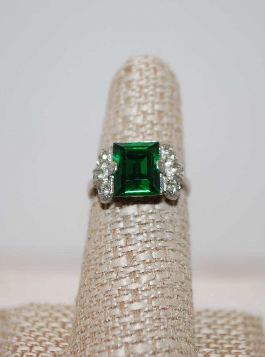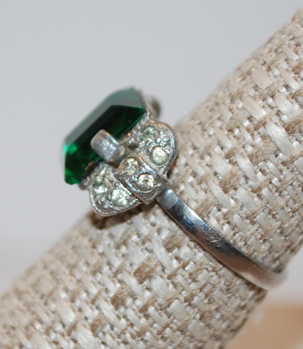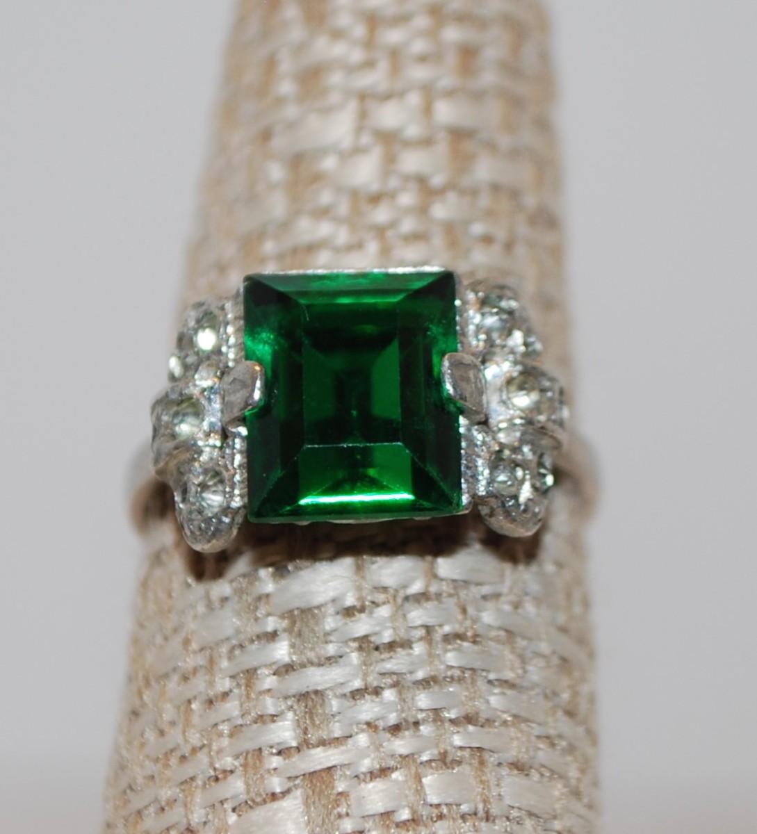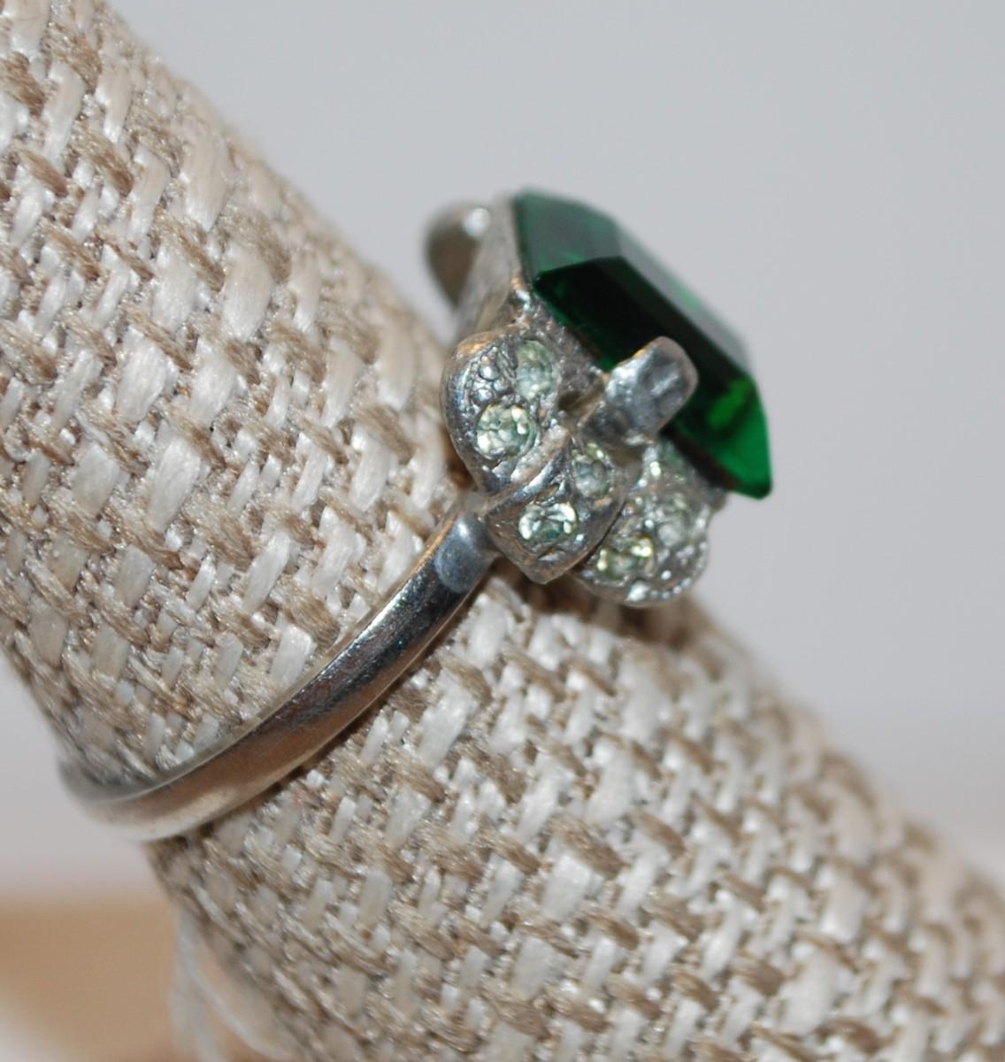 Size 7¼ Vintage Emerald Cut Green Stone with 12 Side Accent Stones on a Silver Tone Band (3.1g)
