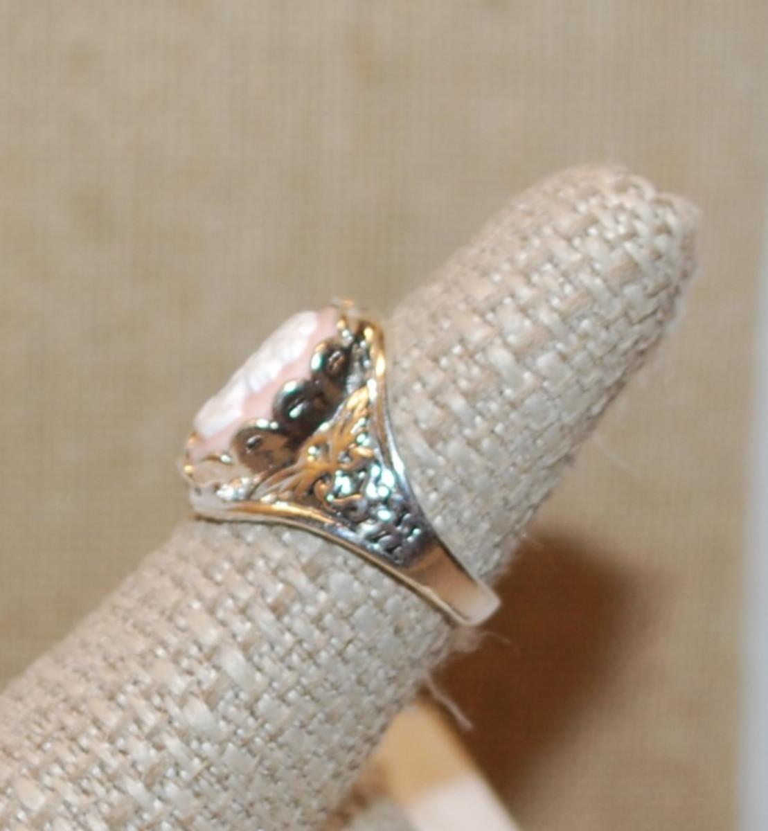Size 7 White Oval Cameo on Pink Ring & Graphic Designed Setting on a Silver Tone Band (6.2g)