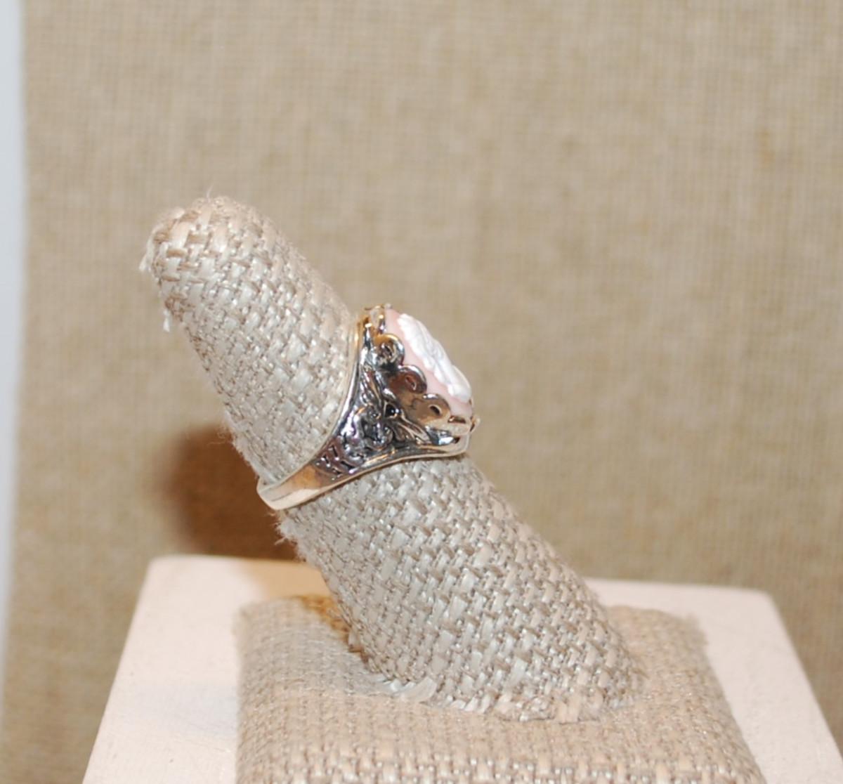 Size 7 White Oval Cameo on Pink Ring & Graphic Designed Setting on a Silver Tone Band (6.2g)