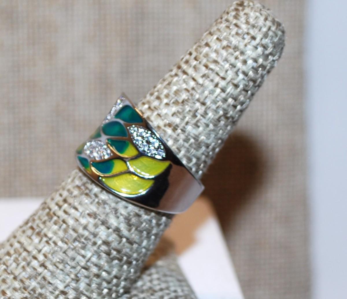 Size 7 Yellow, Blue & Green Enamel Style Ring on a Silver Tone Band (6.7g)