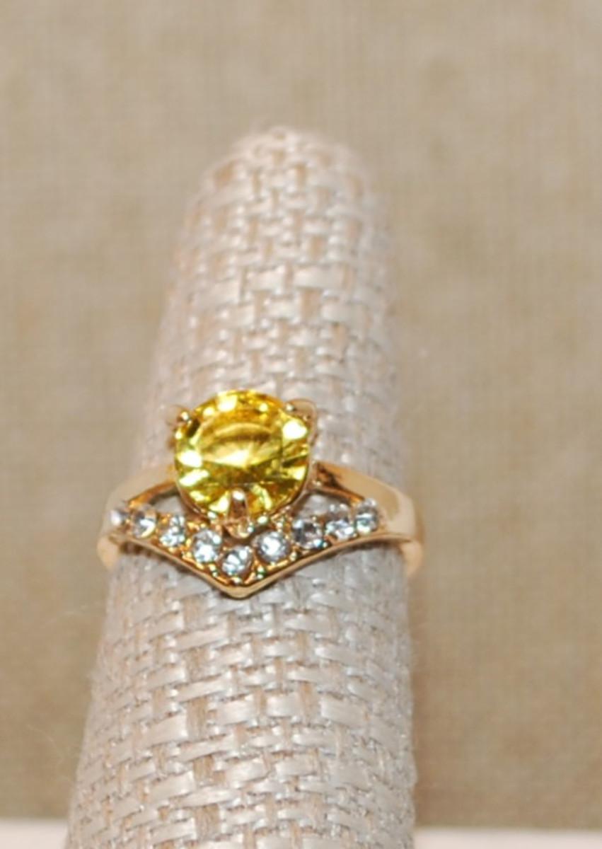 Size 7 Yellow Colored Round Stone Ring with a "V" Clear Stone Accent on a Gold Tone Band (2.6g)