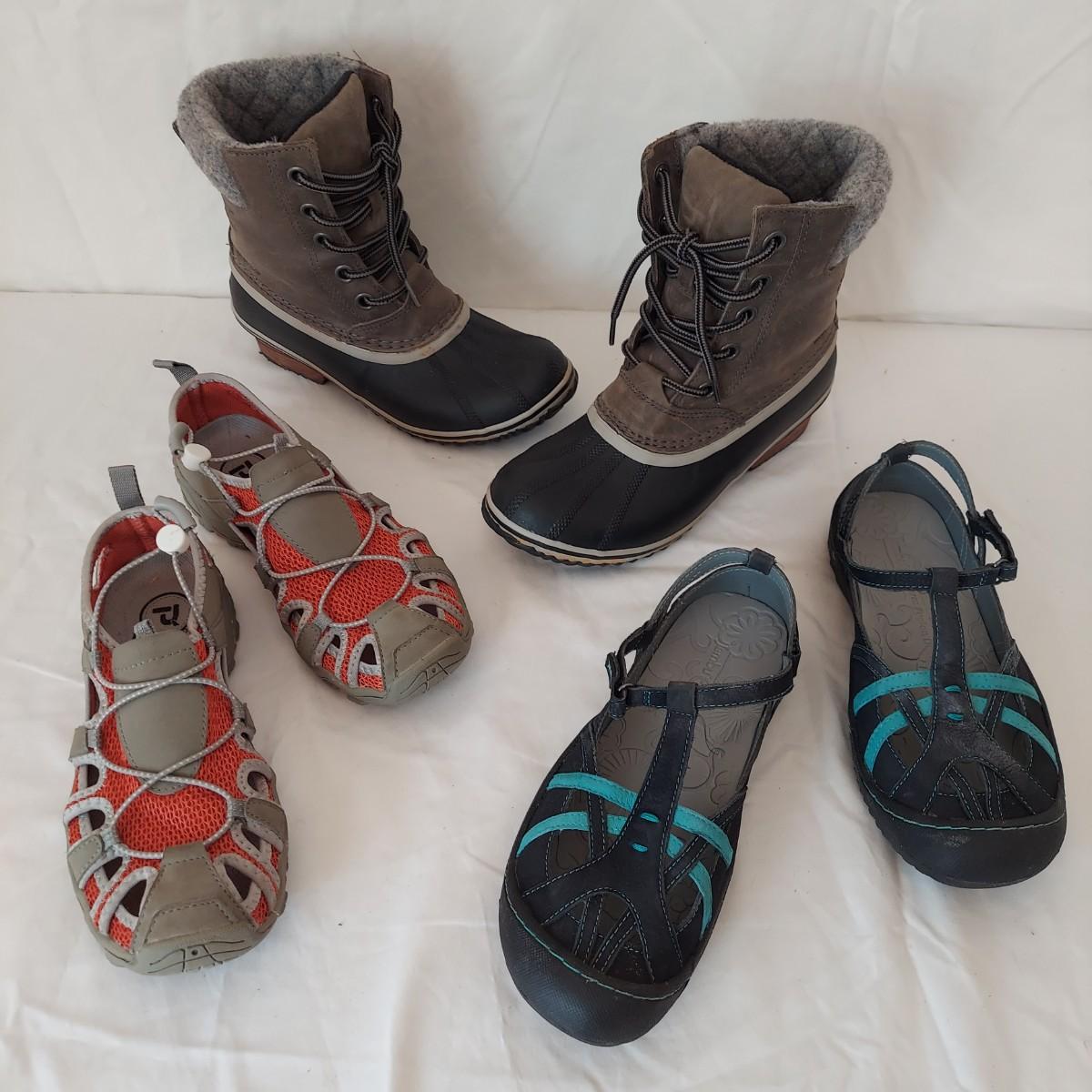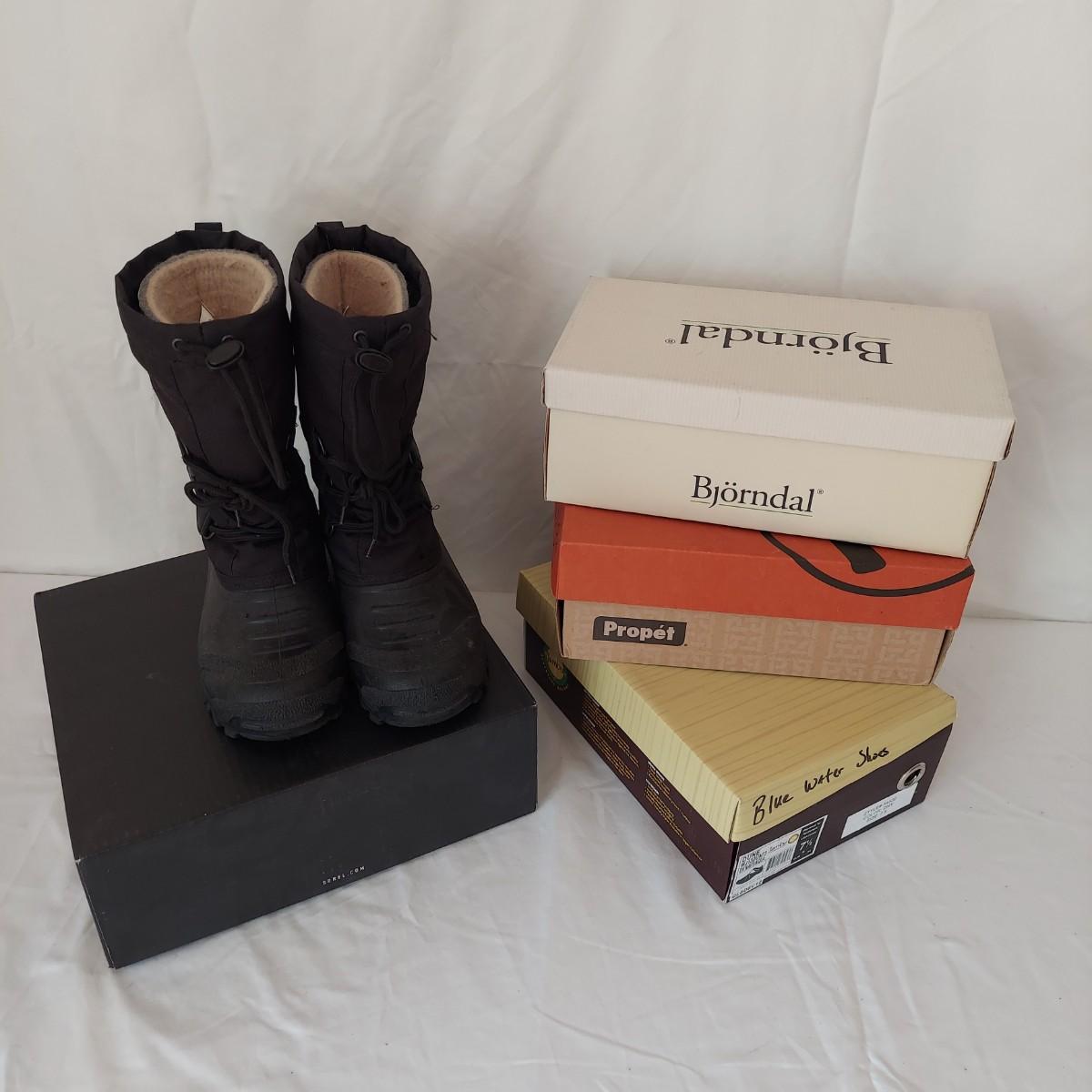 Two pairs of snow boots and three pairs of shoes by outdoor brands like Sorel, Kodiak, Jambu and more. Please see photos for details. Shipping available