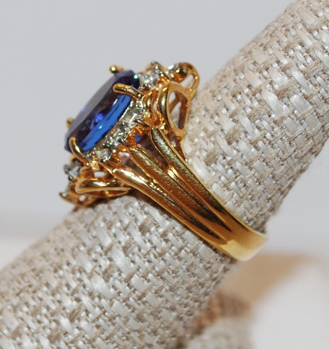 14 k---Size 8 Oval Deep Blue Stone Ring with 12 Clear Stones Surround Ring (7.1g)
