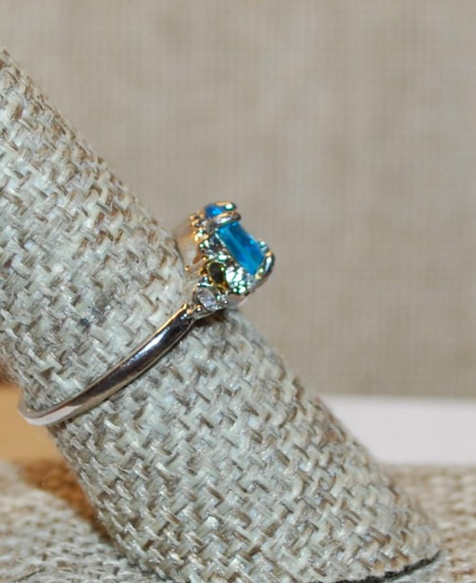 Size 8 Aquamarine Oval Stone Ring with 2 Tone Side Accents on a Silver Tone Setting (2.3g)