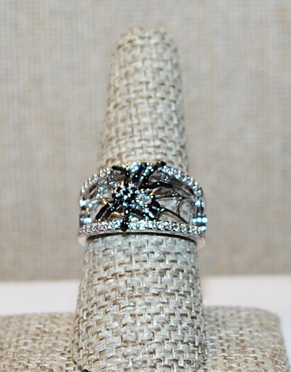 Size 8 BLACK SPIDER Ring with Bright Clear Stone Accents on a Hollowed Web Style Band (4,9g)