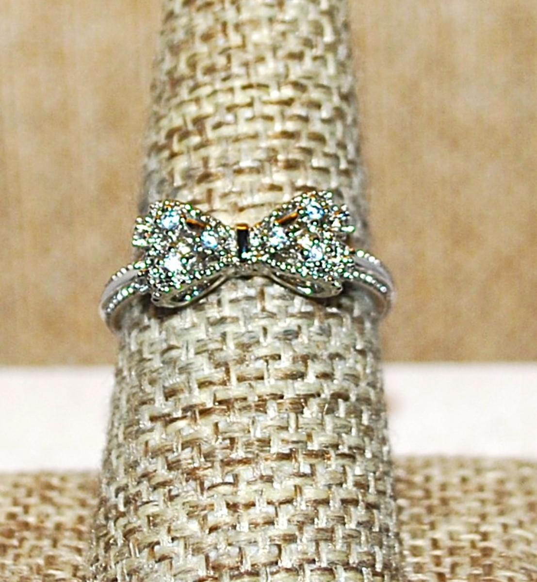 Size 8 "BOWTIE" Style Ring with Triple Clear Stone Sides and Dimpled Silver Tone Band (3.2g)