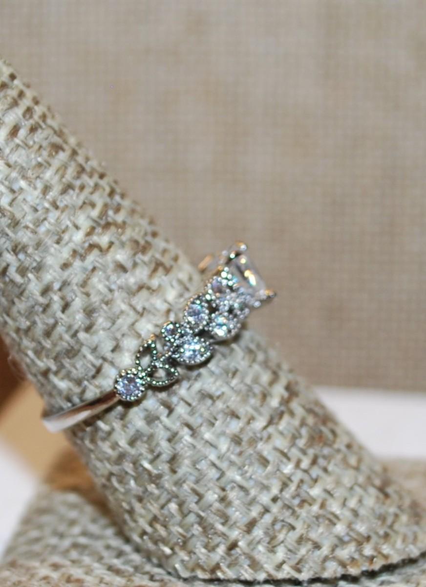 Size 8¼ Clear HEART Stone Ring with Clear "Leaf" Side Accents on a Silver Tone Band (2.2g)