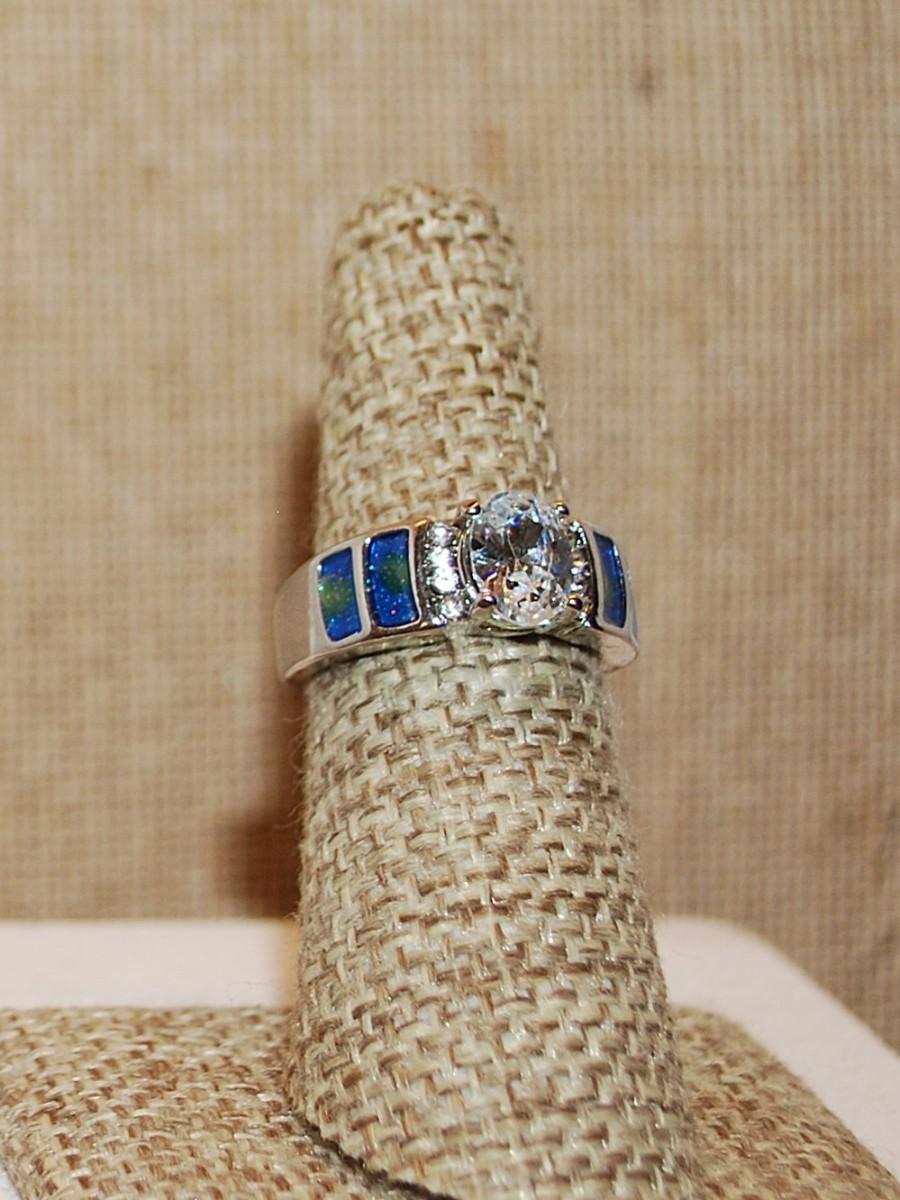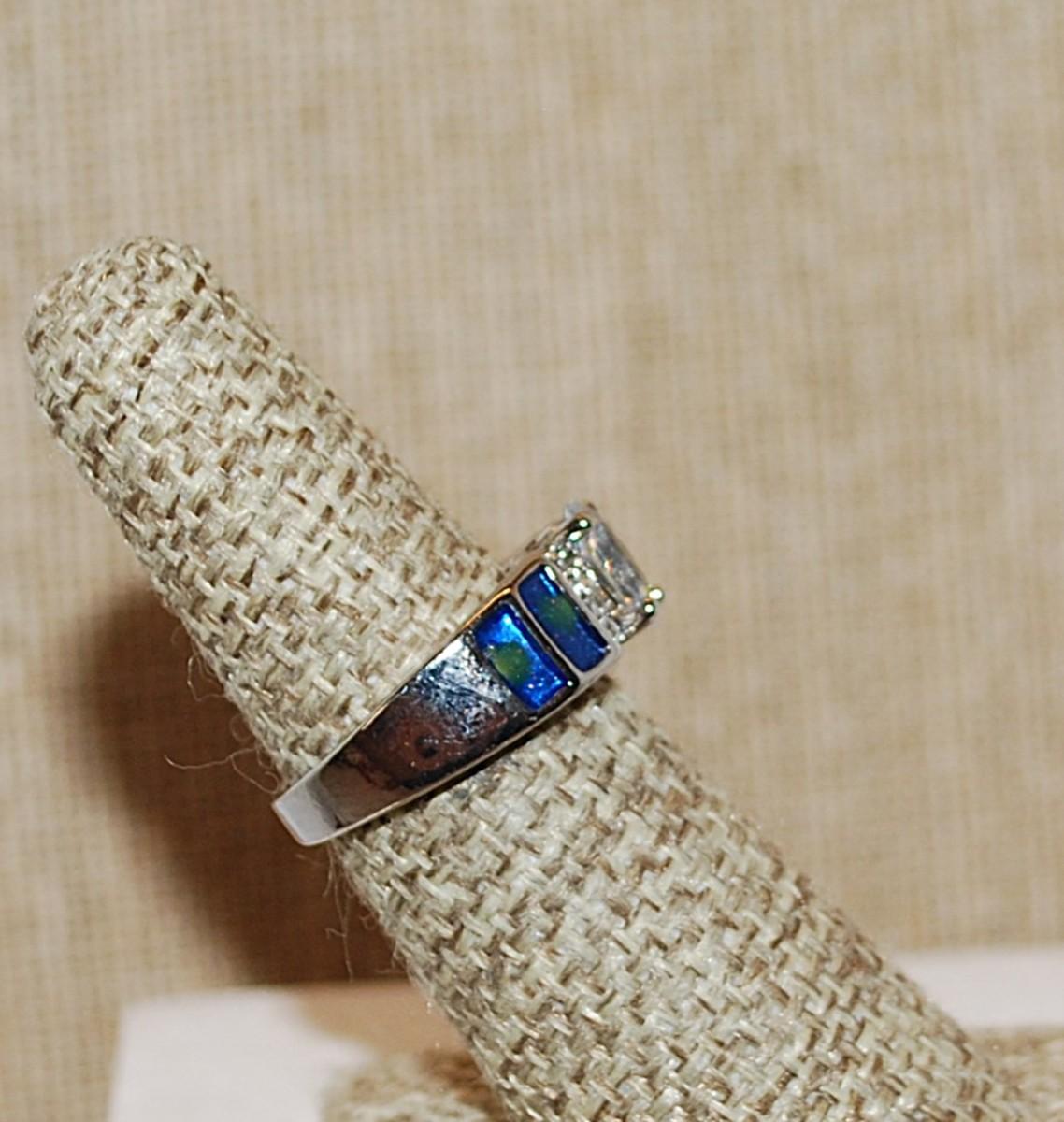 Size 8 Clear Oval Center Stone & 4 Blue & Yellow "Panels" Ring with 8 Side Accent Stones on a Silver Tone Band (5.0g)