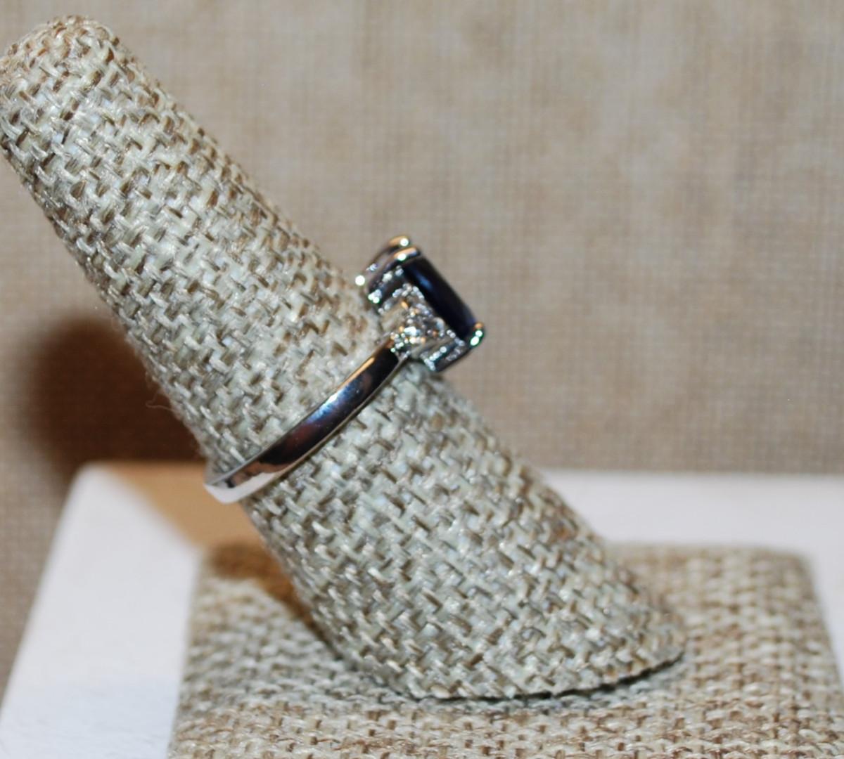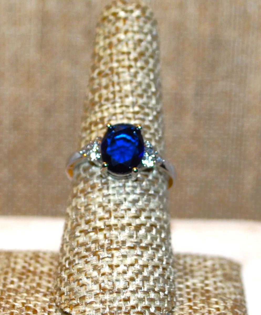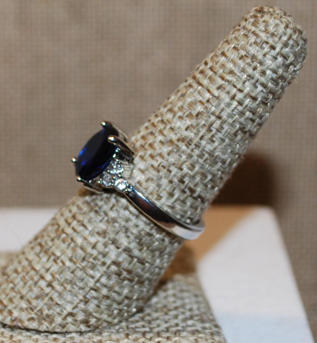 Size 8 Deep Blue Oval Center Stone Ring with 3 Clear Stones Side Accents on a Silver Tone Band (2.9g)