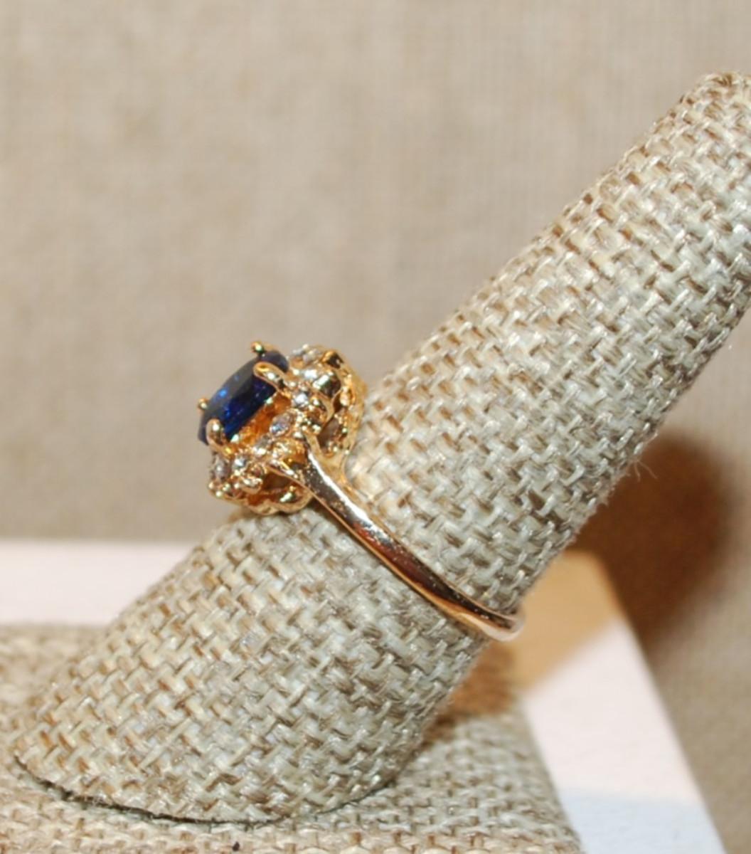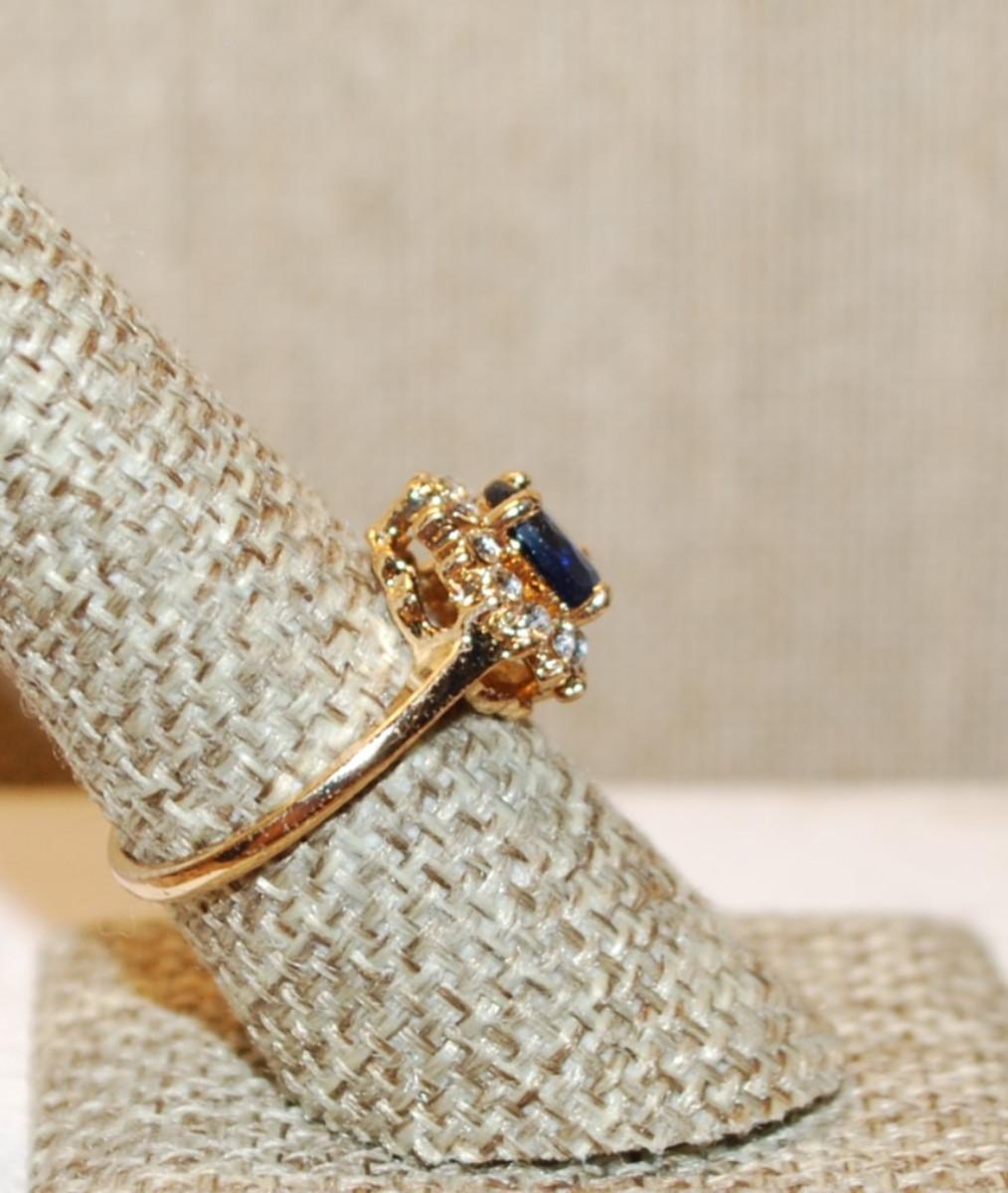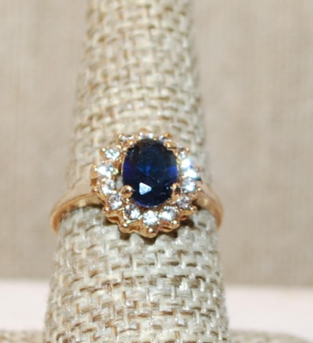 Size 8 Deep Blue Oval Cut Stone Ring with a Full Surround of Clear Stones on a Gold Tone Band (2.8g)