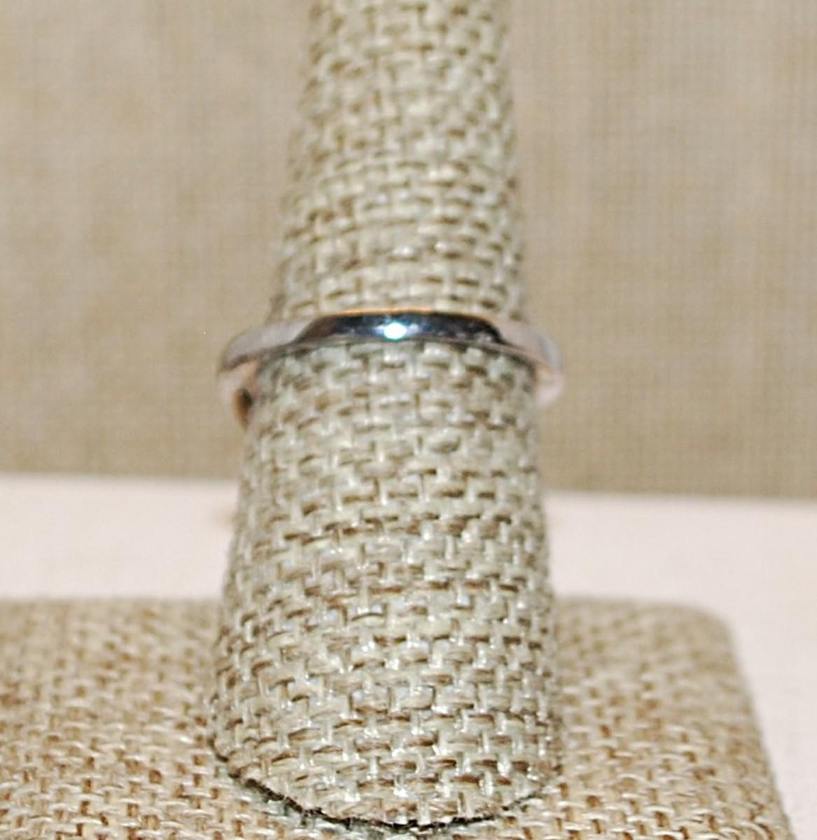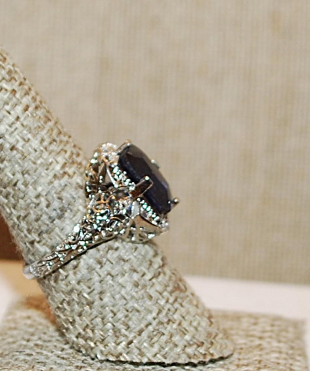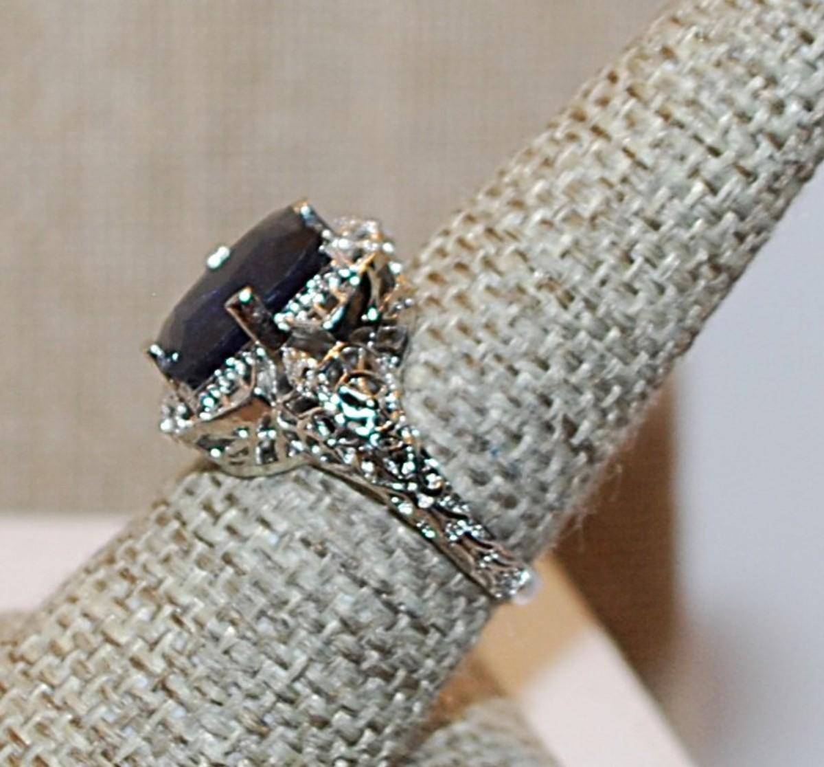 Size 8¼ Deep BLUE Rectangle Stone Ring on a "Spider Web" Nest & Surround on a Silver Tone Band (3.9g)