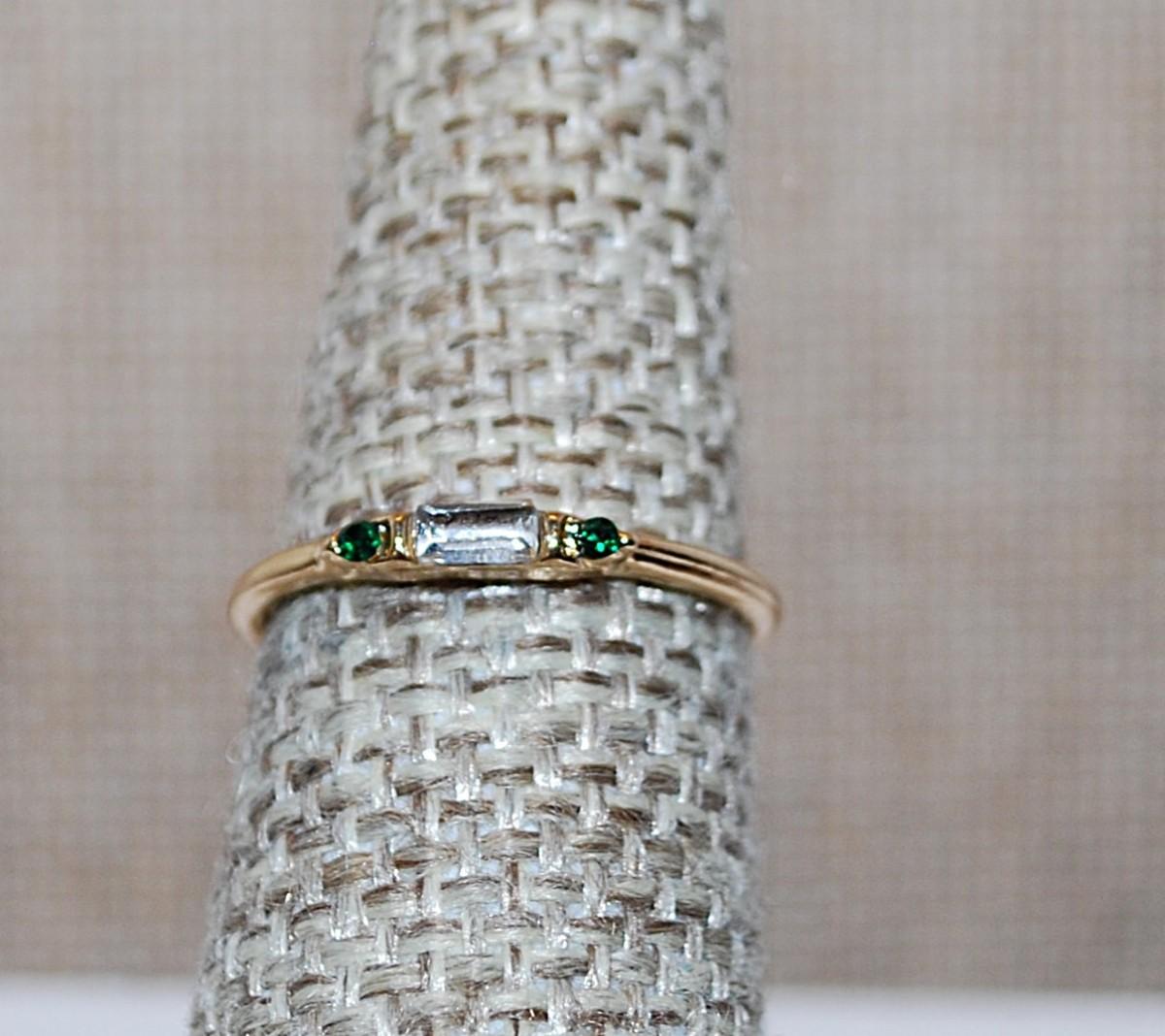 Size 8 Delicate Horizontal Clear Stone & 2 Round GREEN Stones on a Gold Tone Band (1.1g)