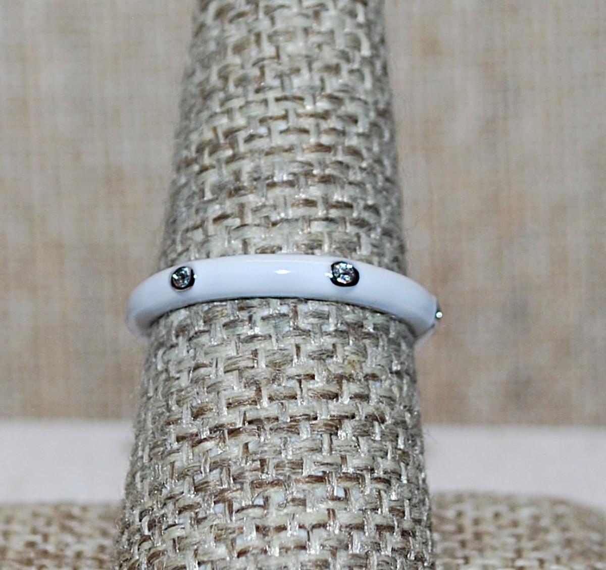 Size 8 Delicate WHITE Enamel Ring with 6 Accent Clear Stones on a Silver Tone Band (2.2g) - STACK ALL COLORS for a REAL IMPACT