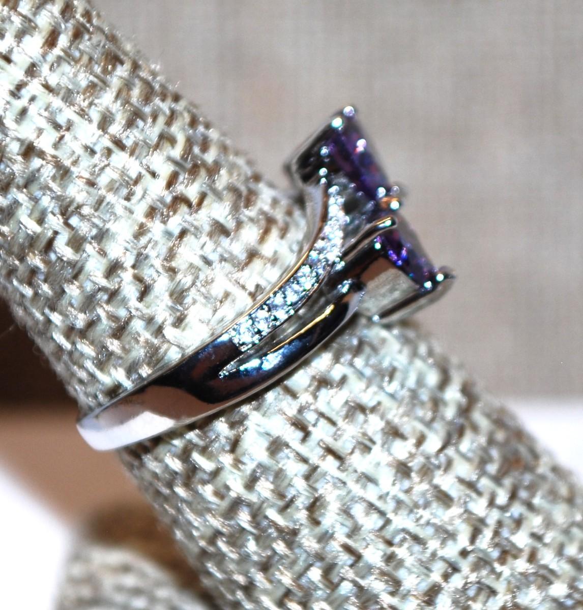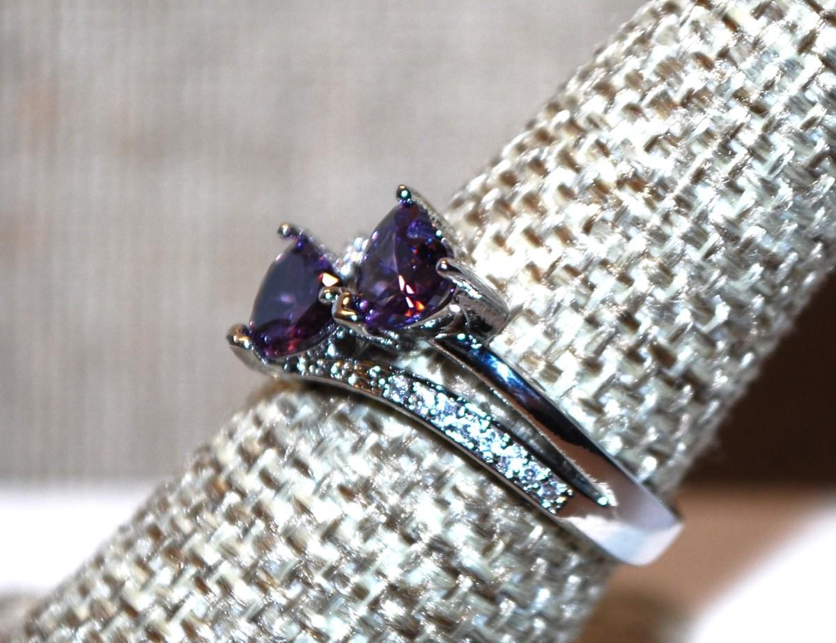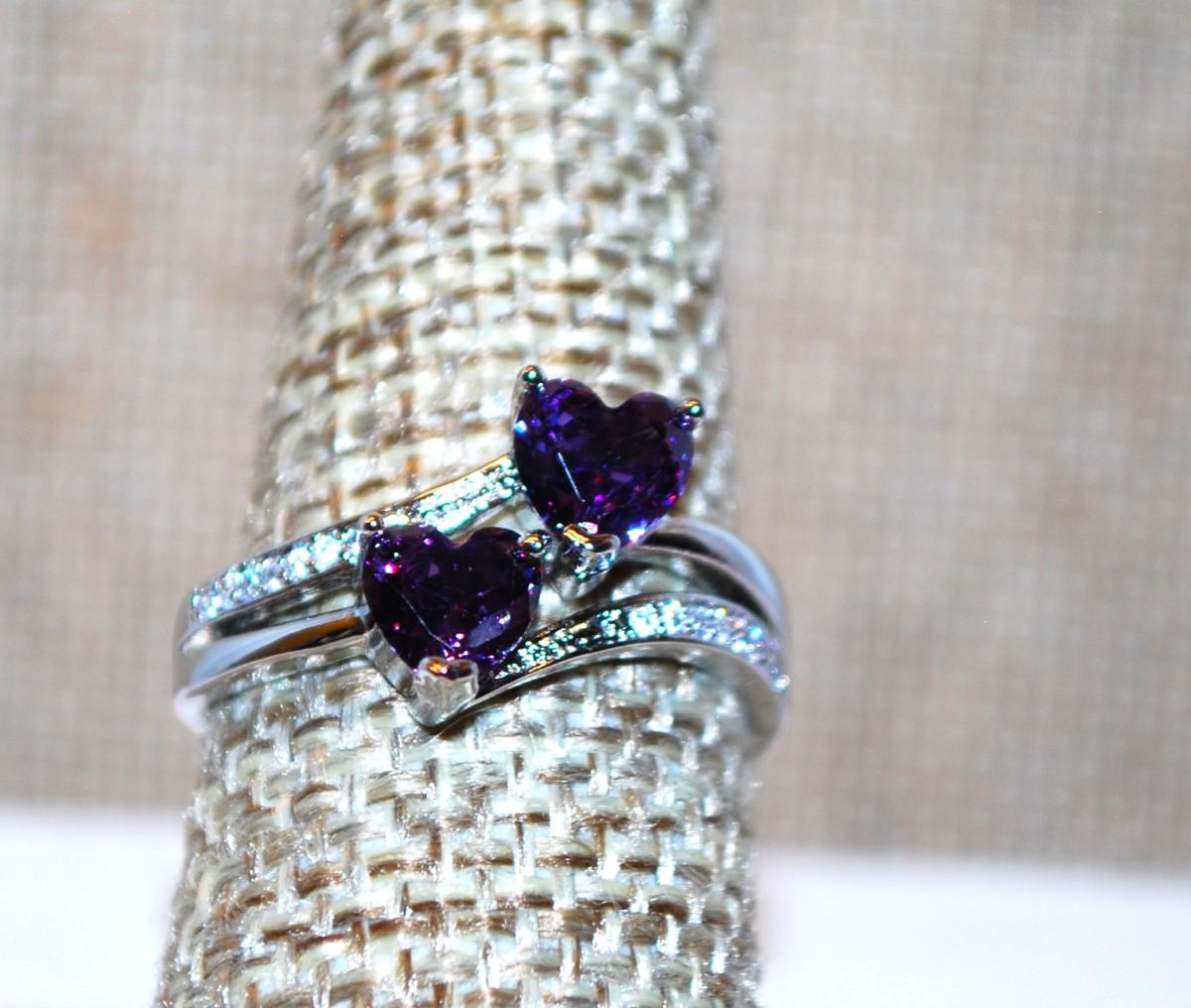 Size 8 Double Connected Purple Hearts Ring with Accent Stones Lines on a Silver Tone Band (3.3g)