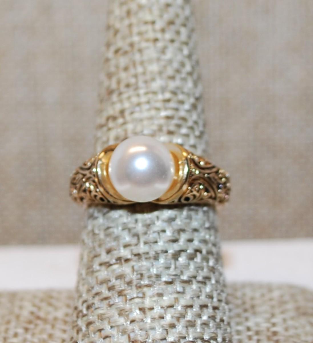 Size 8 Faux White Pearl Ring with Designed Gold Tone Band (4.2g)
