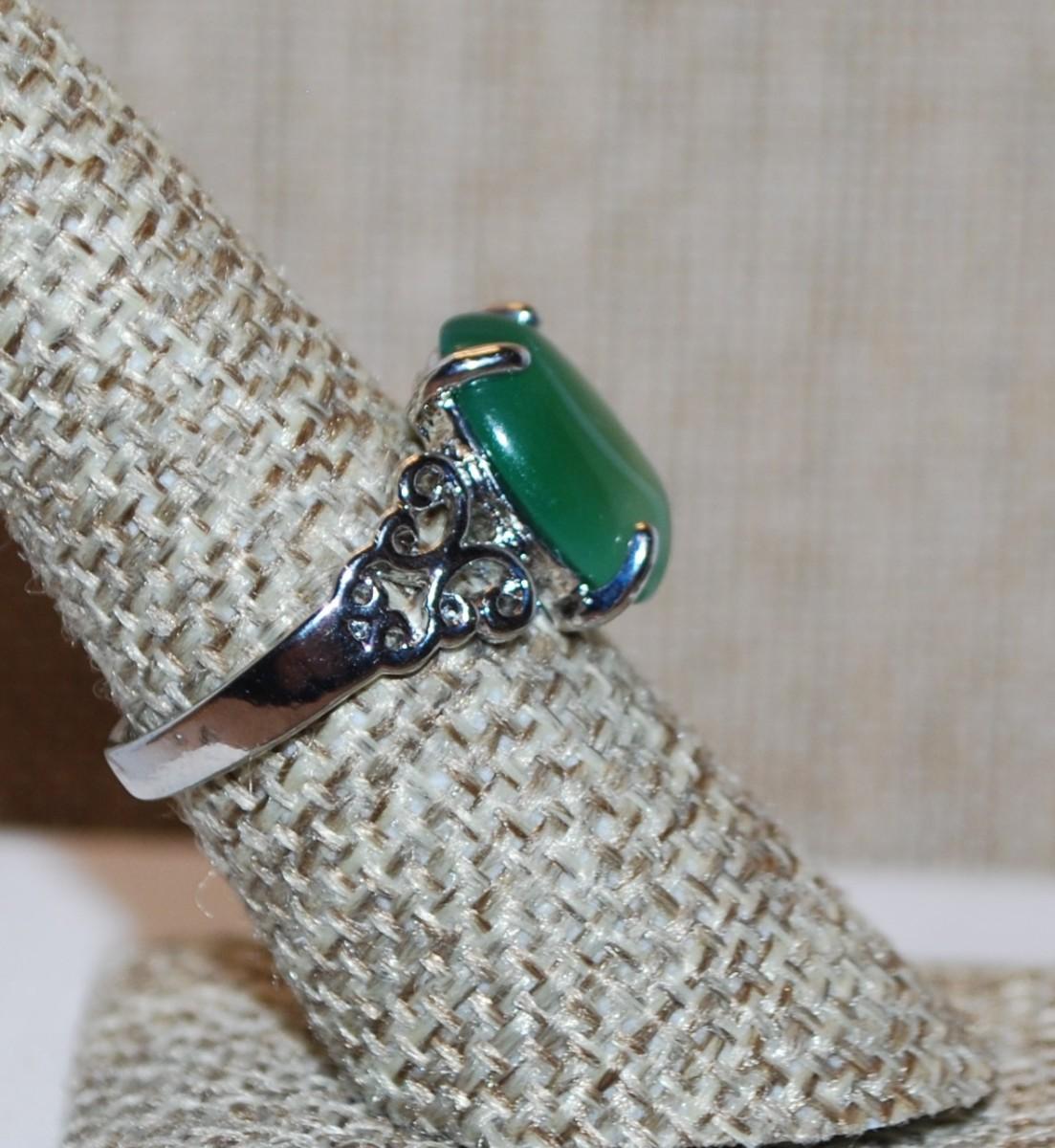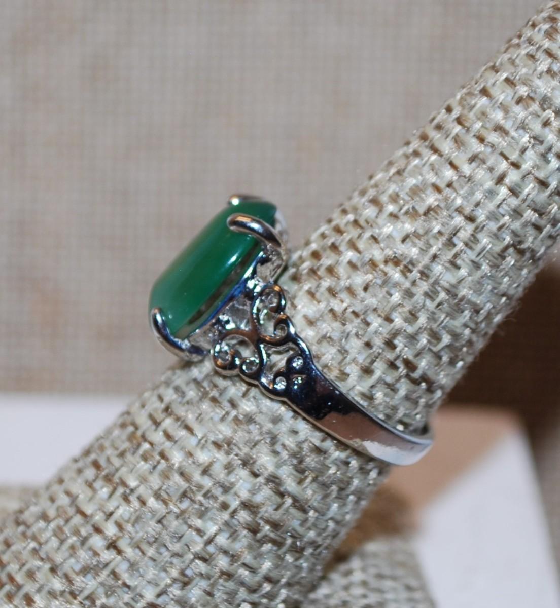 Size 8 Green Aventurine Oval Stone Ring with Side Swirls on a Silver Tone Band (3.6g)