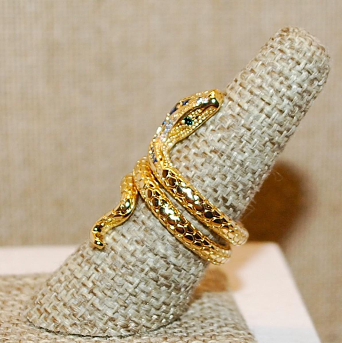 Size 8 ¼ GREEN EYED Snake Ring with BLUE Receding Sized Stones on the Head on a "Scaled" Gold Tone Band (6.6g)