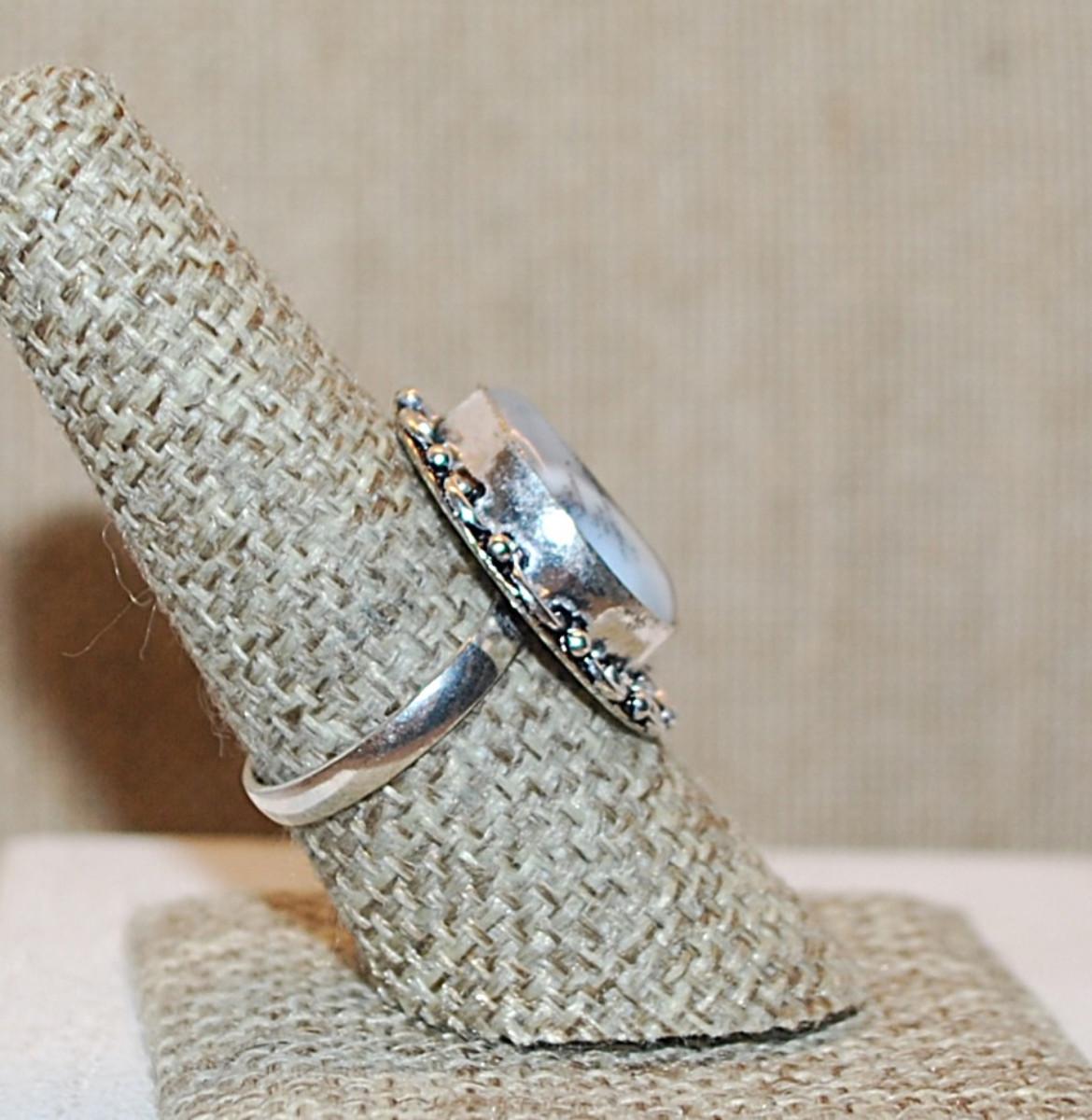 Size 8 HALF CIRCLE Shape MILKY OPALITE Gemstone Ring with Full Rope Surround on a Silver Tone Band (4.5g)