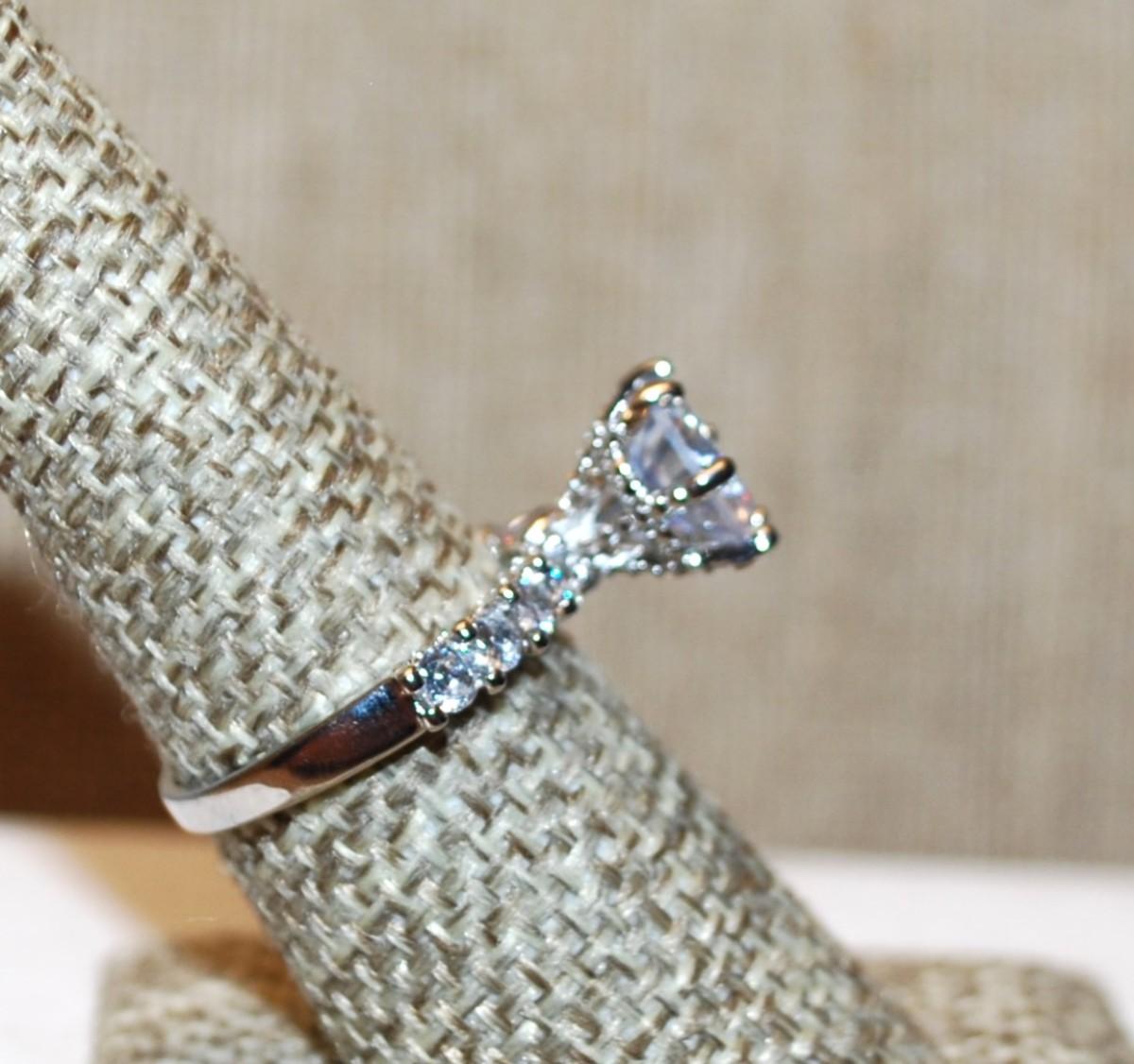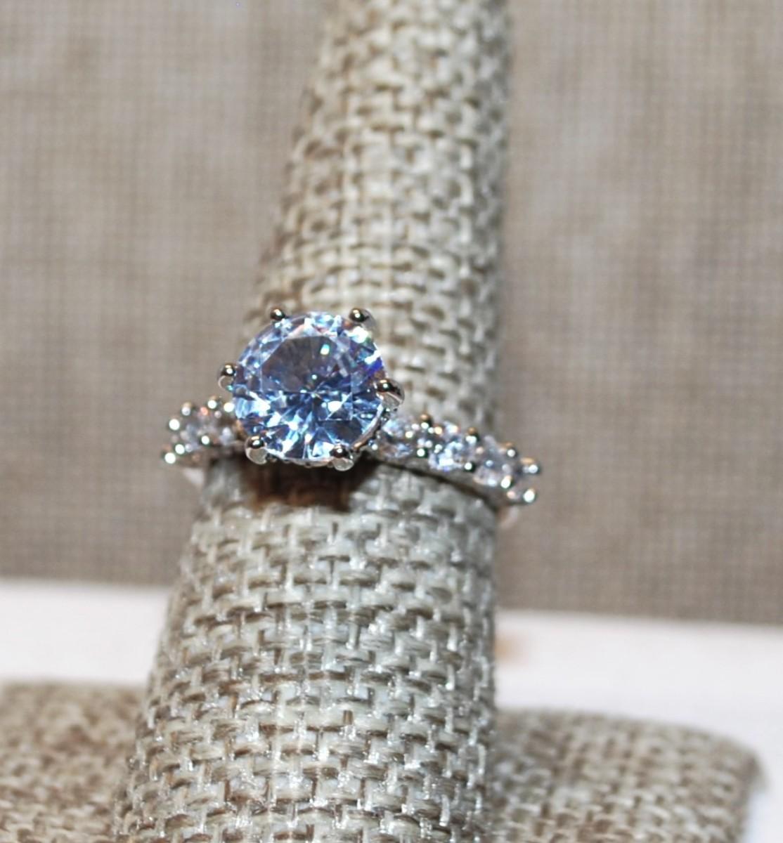 Size 8 Highrise Style Wedding/Engagement Ring with Large Main Stone & Side Accents on a Silver Tone Band (3.6g