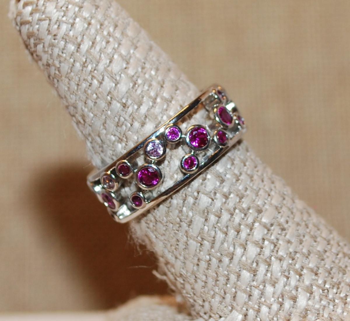 Size 8¼ Hollowed Infinity Style Setting with Violet Magenta & Clear Stone "Circles" on a Silver Tone Band (4.9g)