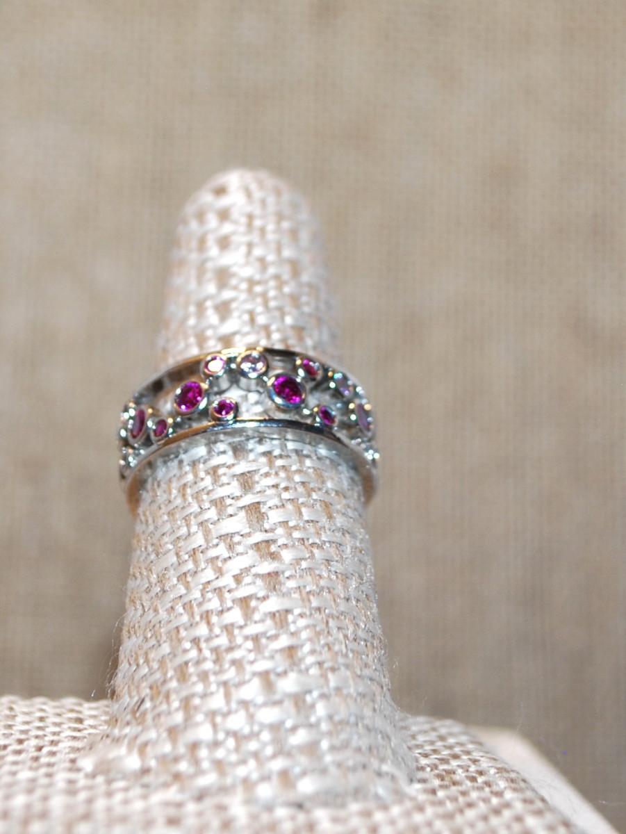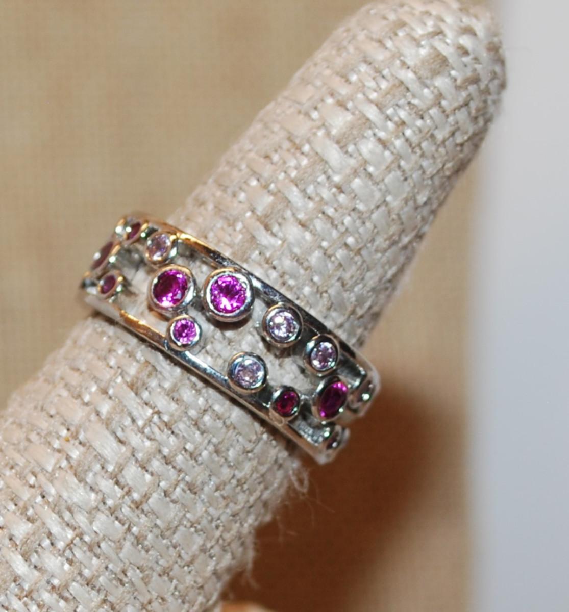 Size 8¼ Hollowed Infinity Style Setting with Violet Magenta & Clear Stone "Circles" on a Silver Tone Band (4.9g)